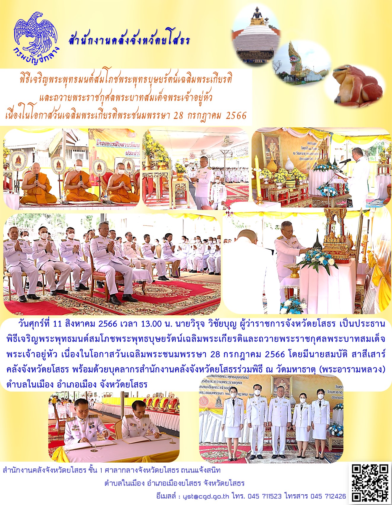 วันศุกร์ที่ 11 สิงหาคม 2566 เวลา 13.00 น. นายวิรุจ วิชัยบุญ ผู้ว่าราชการจังหวัดยโสธร เป็นประธาน พิธีเจริญพระพุทธมนต์สมโภชพระพุทธบุษยรัตน์เฉลิมพระเกียรติและถวายพระราชกุศลพระบาทสมเด็จ พระเจ้าอยู่หัว เนื่องในโอกาสวันเฉลิมพระชนมพรรษา 28 กรกฎา