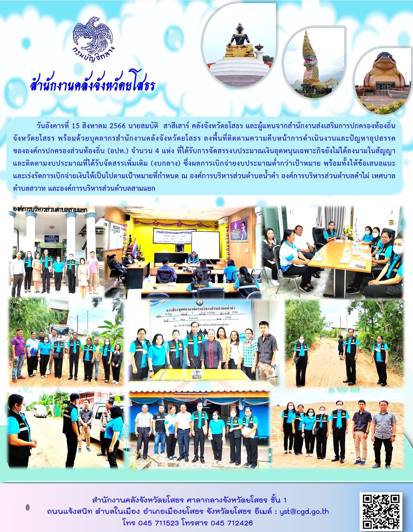 วันอังคารที่ 15 สิงหาคม 2566 นายสมบัติ สาสีเสาร์ คลังจังหวัดยโสธร และผู้แทนจากสำนักงานส่งเสริมการปกครองท้องถิ่นจังหวัดยโสธร พร้อมด้วยบุคลากรสำนักงานคลังจังหวัดยโสธร ลงพื้นที่ติดตามความคืบหน้าการดำเนินงานและปัญหาอุปสรรค ขององค์กรปกครองส่วนท้องถิ่