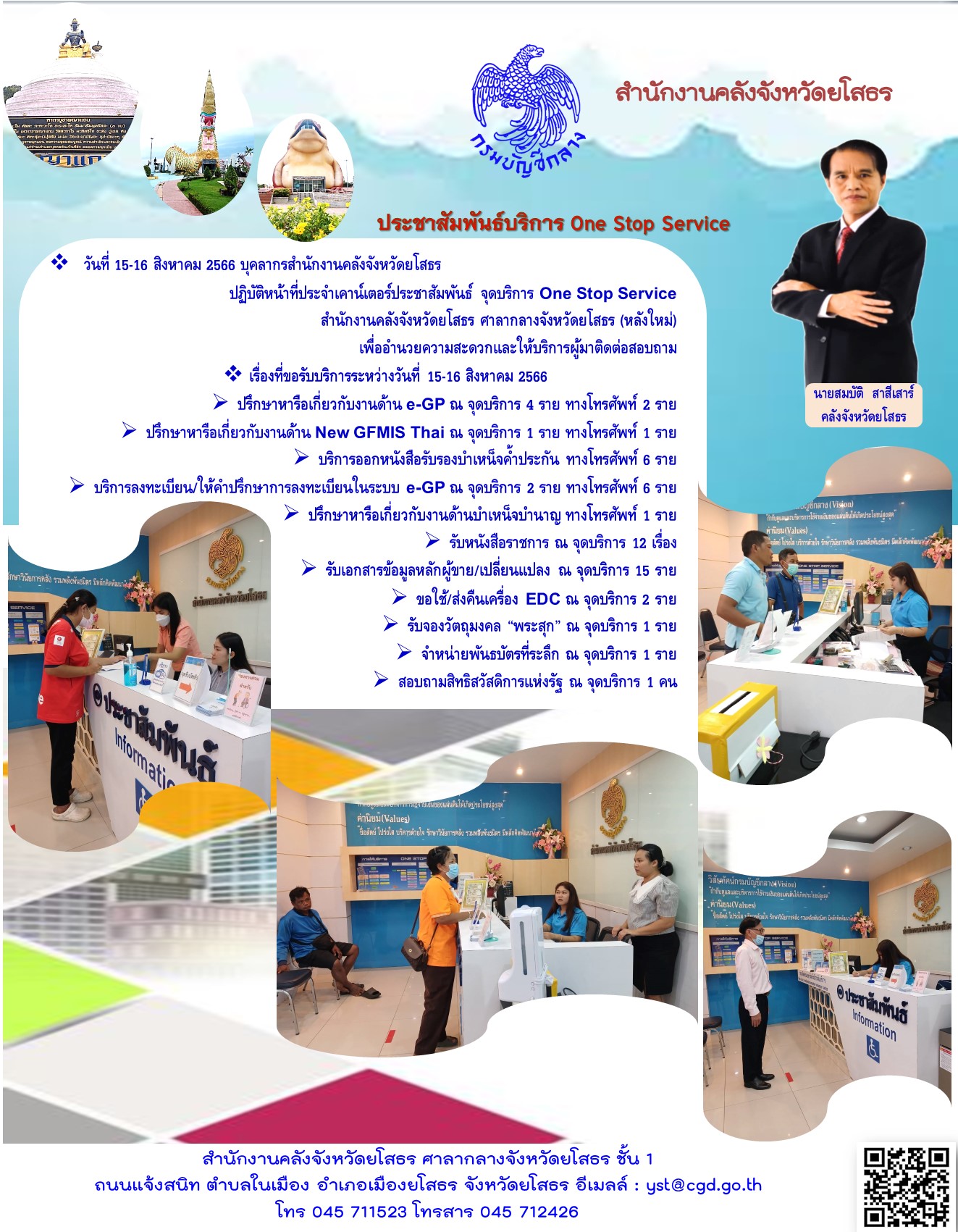 วันที่ 15-16 สิงหาคม 2566 บุคลากรสำนักงานคลังจังหวัดยโสธร ปฏิบัติหน้าที่ประจำเคาน์เตอร์ประชาสัมพันธ์ จุดบริการ One Stop Service สำนักงานคลังจังหวัดยโสธร ศาลากลางจังหวัดยโสธร (หลังใหม่) เพื่ออำนวยความสะดวกและให้บริการผู้มาติดต่อสอบถาม