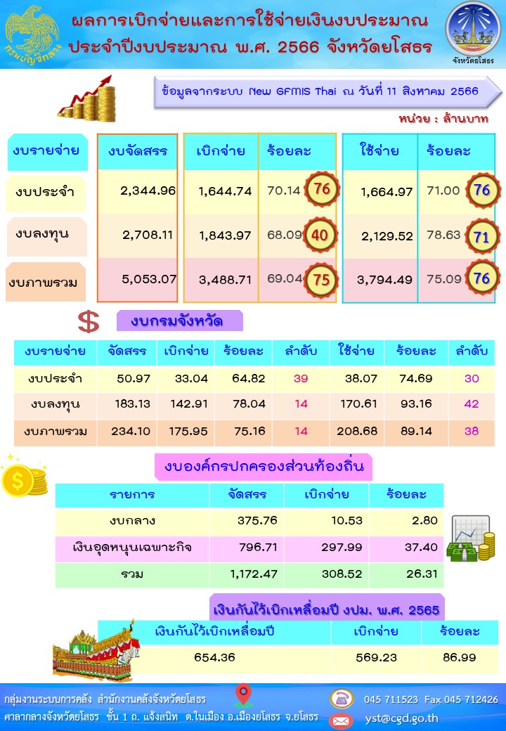 รายงานผลการเบิกจ่ายและใช้จ่ายเงินงบประมาณของจังหวัดยโสธร ข้อมูล ณ วันที่ 11 สิงหาคม 2566 สามารถดูได้ตาม (thumbtack) ระบบติดตามสถานะการใช้จ่ายงบประมาณของจังหวัดยโสธร http://yst-cgd.com/