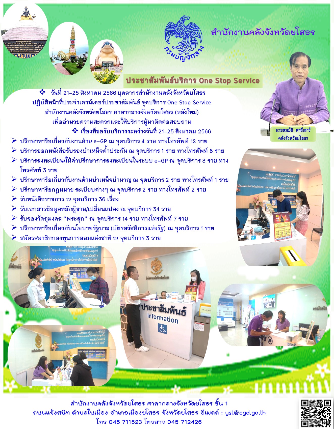 วันที่ 21-25 สิงหาคม 2566 บุคลากรสำนักงานคลังจังหวัดยโสธร ปฏิบัติหน้าที่ประจำเคาน์เตอร์ประชาสัมพันธ์ จุดบริการ One Stop Service สำนักงานคลังจังหวัดยโสธร ศาลากลางจังหวัดยโสธร (หลังใหม่) เพื่ออำนวยความสะดวกและให้บริการผู้มาติดต่อสอบถาม เรื่องที่ขอรั