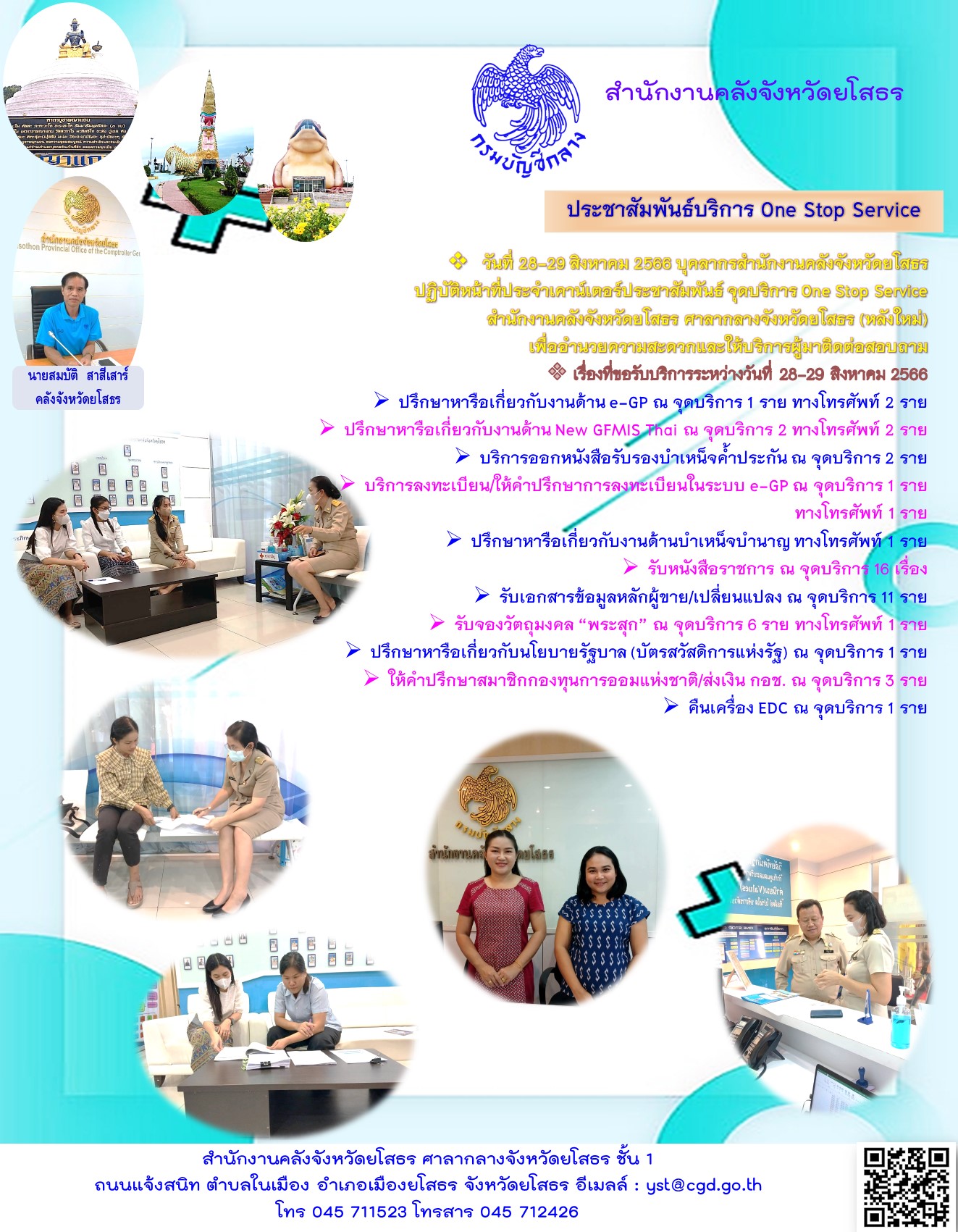 วันที่ 28-29 สิงหาคม 2566 บุคลากรสำนักงานคลังจังหวัดยโสธร ปฏิบัติหน้าที่ประจำเคาน์เตอร์ประชาสัมพันธ์ จุดบริการ One Stop Service สำนักงานคลังจังหวัดยโสธร ศาลากลางจังหวัดยโสธร (หลังใหม่) เพื่ออำนวยความสะดวกและให้บริการผู้มาติดต่อสอบถาม เรื่องที่ขอรั