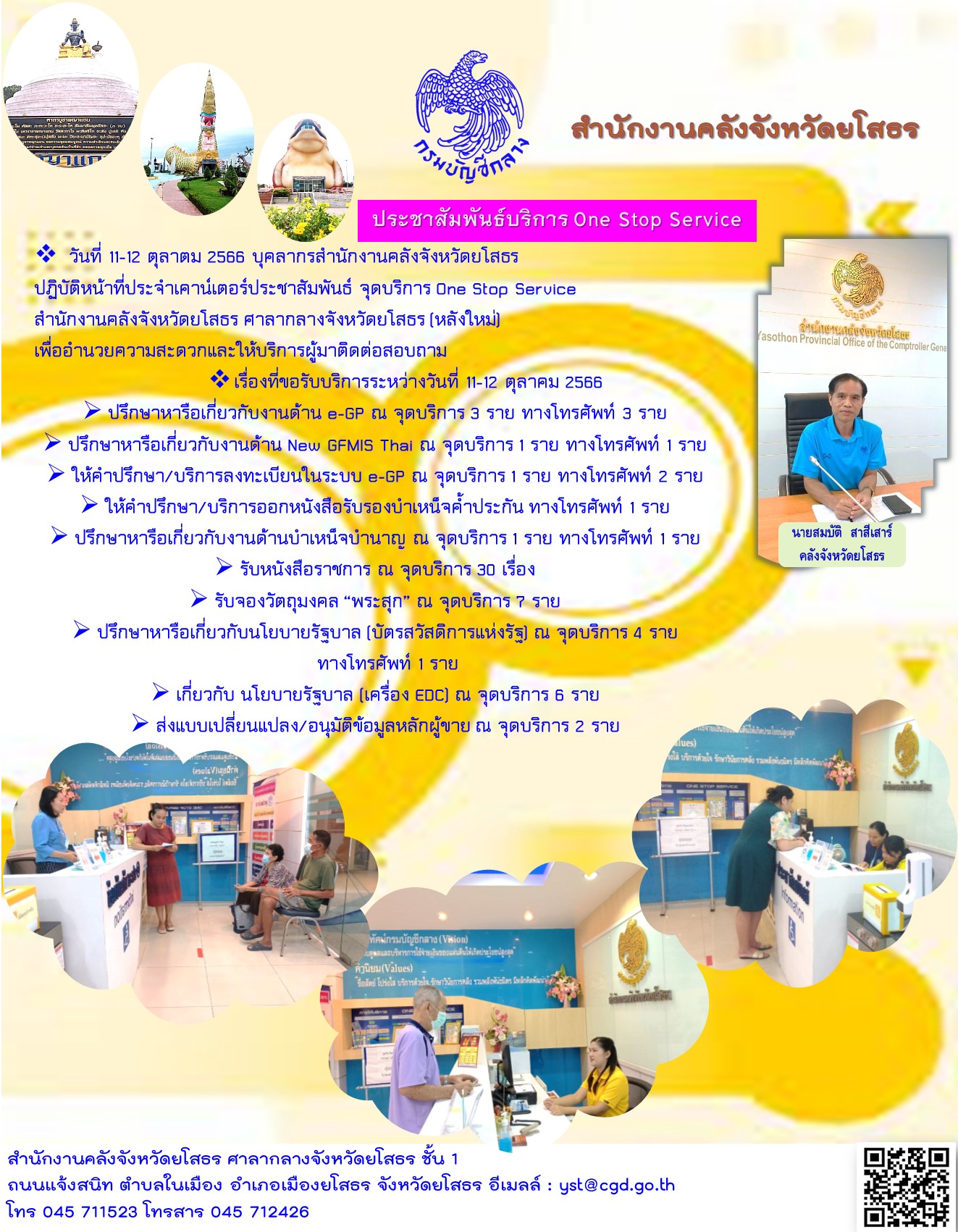 วันที่ 11-12 ตุลาตม 2566 บุคลากรสำนักงานคลังจังหวัดยโสธร ปฏิบัติหน้าที่ประจำเคาน์เตอร์ประชาสัมพันธ์ จุดบริการ One Stop Service สำนักงานคลังจังหวัดยโสธร ศาลากลางจังหวัดยโสธร (หลังใหม่) เพื่ออำนวยความสะดวกและให้บริการผู้มาติดต่อสอบถาม เรื่องที่ขอรับ