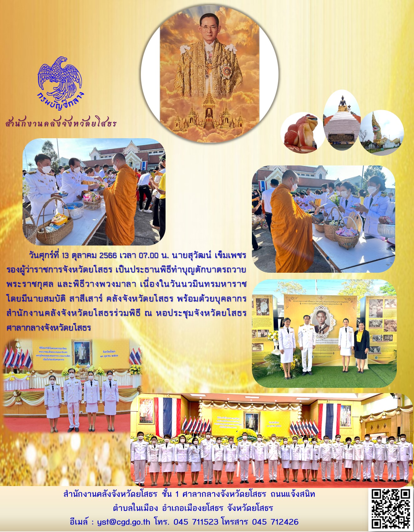 วันศุกร์ที่ 13 ตุลาคม 2566 เวลา 07.00 น. นายสุวัฒน์ เข็มเพชรรองผู้ว่าราชการจังหวัดยโสธร เป็นประธานพิธีทำบุญตักบาตรถวาย พระราชกุศล และพิธีวางพวงมาลา เนื่องในวันนวมินทรมหาราช โดยมีนายสมบัติ สาสีเสาร์ คลังจังหวัดยโสธร พร้อมด้วยบุคลากรสำนักงานคลังจั