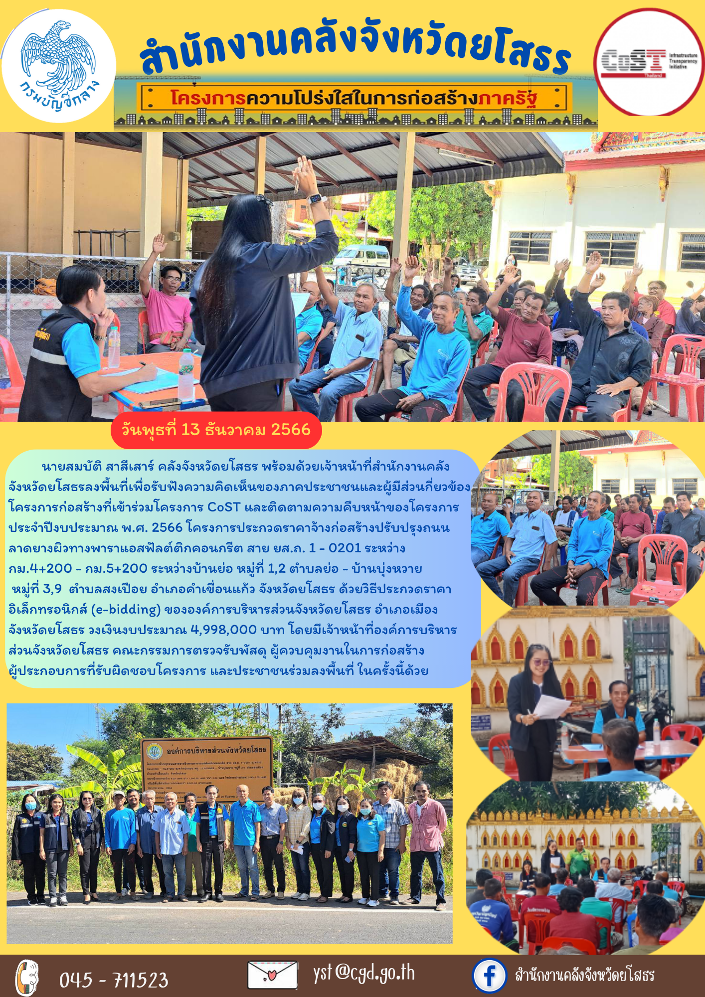 วันพุธที่ 13 ธันวาคม 2566 นายสมบัติ สาสีเสาร์ คลังจังหวัดยโสธร พร้อมด้วยเจ้าหน้าที่สำนักงานคลังจังหวัดยโสธรลงพื้นที่เพื่อรับฟังความคิดเห็นของภาคประชาชนและผู้มีส่วนกี่ยวข้องโครงการก่อสร้างที่เข้าร่วมโครงการ CoST และติดตามความคืบหน้าของโครงการ ประจำปีงบประมาณ พ.ศ. 2566 โครงการประกวดราคาจ้างก่อสร้างปรับปรุงถนนลาดยางผิวทางพาราแอสฟัลต์ติกคอนกรีต สาย ยส.ถ. 1 - 0201 ระหว่าง กม.4+200 - กม.5+200 ระหว่างบ้านย่อ หมู่ที่ 1,2 ตำบลย่อ – บ้านบุ่งหวาย หมู่ที่ 3,9 ตำบลสงเปือย อำเภอคำเขื่อนแก้ว จังหวัดยโสธร ด้วยวิธีประกวดราคาอิเล็กทรอนิกส์ (e-bidding) ขององค์การบริหารส่วนจังหวัดยโสธร อำเภอเมือง จังหวัดยโสธร วงเงินงบประมาณ 4,998,000 บาท โดยมีเจ้าหน้าที่องค์การบริหารส่วนจังหวัดยโสธร คณะกรรมการตรวจรับพัสดุ ผู้ควบคุมงานในการก่อสร้าง ผู้ประกอบการที่รับผิดชอบโครงการ และประชาชนร่วมลงพื้นที่ ในครั้งนี้ด้วย- 13 เม.ย.2569