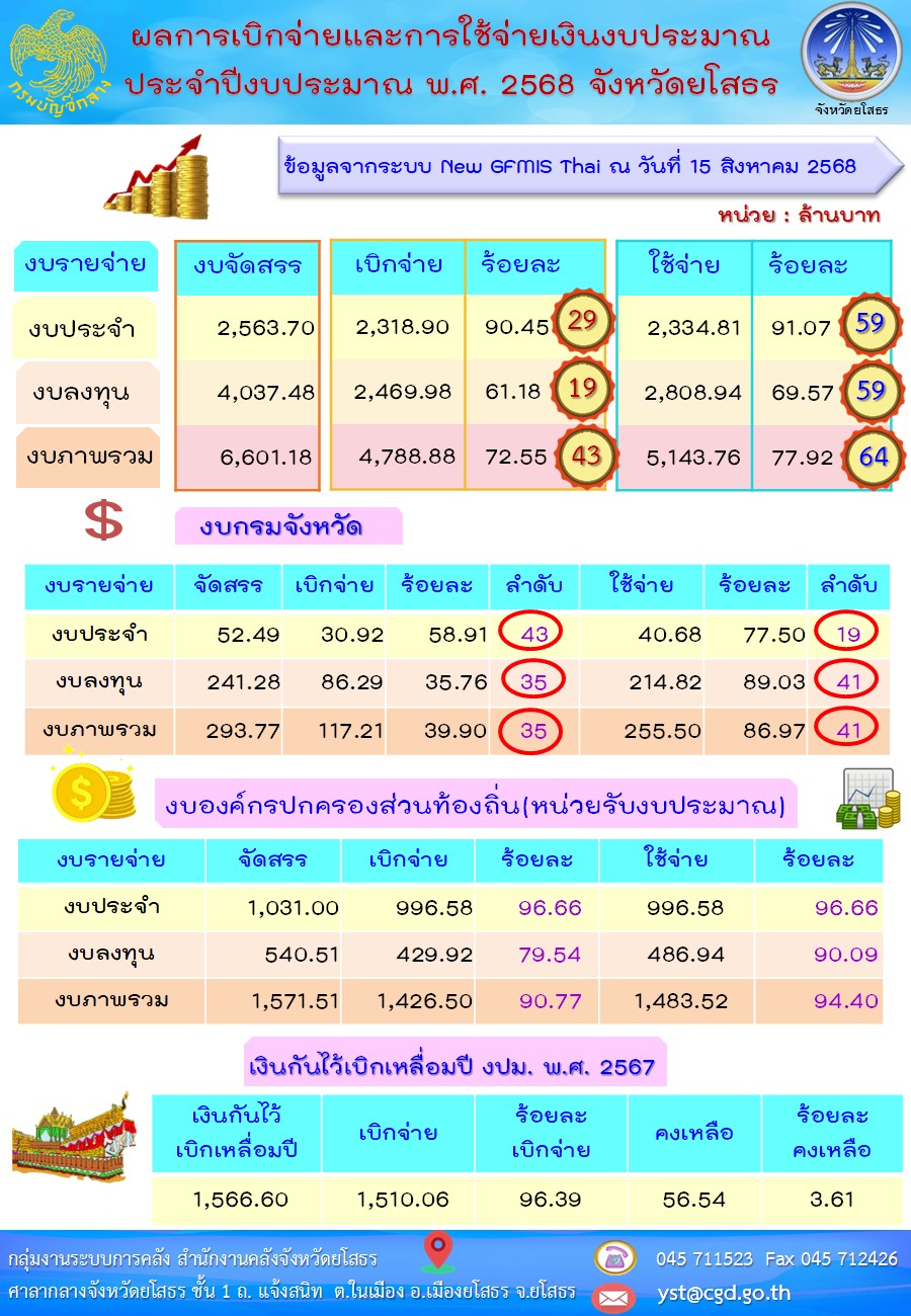 วันที่ 21 ส.ค. 2568 (09:23 น.)รายงานผลการเบิกจ่ายและใช้จ่ายงบประมาณจังหวัดยโสธร ณ วันที่ 15 สิงหาคม 2568