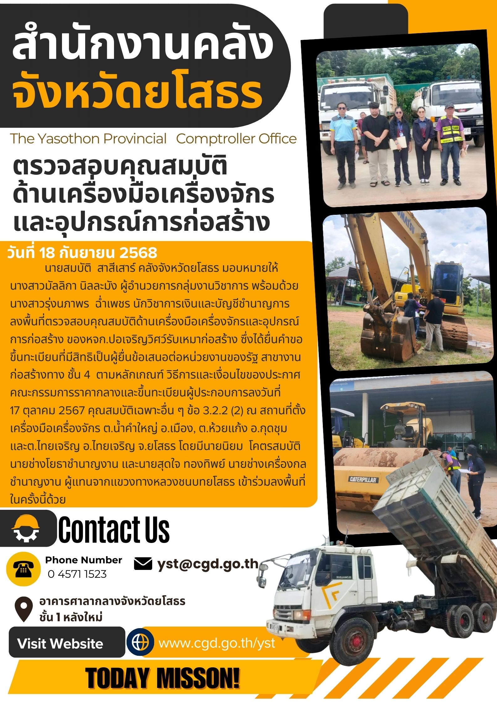 วันที่ 18 กันยายน 2568 นายสมบัติ สาสีเสาร์ คลังจังหวัดยโสธร มอบหมายให้นางสาวมัลลิกา นิลละมัง ผู้อำนวยการกลุ่มงานวิชาการ พร้อมด้วย นางสาวรุ่งนภาพร ฉ่ำเพชร นักวิชาการเงินและบัญชีชำนาญการ ลงพื้นที่ตรวจสอบคุณสมบัติด้านเครื่องมือเครื่องจักรและอุปกรณ์การก