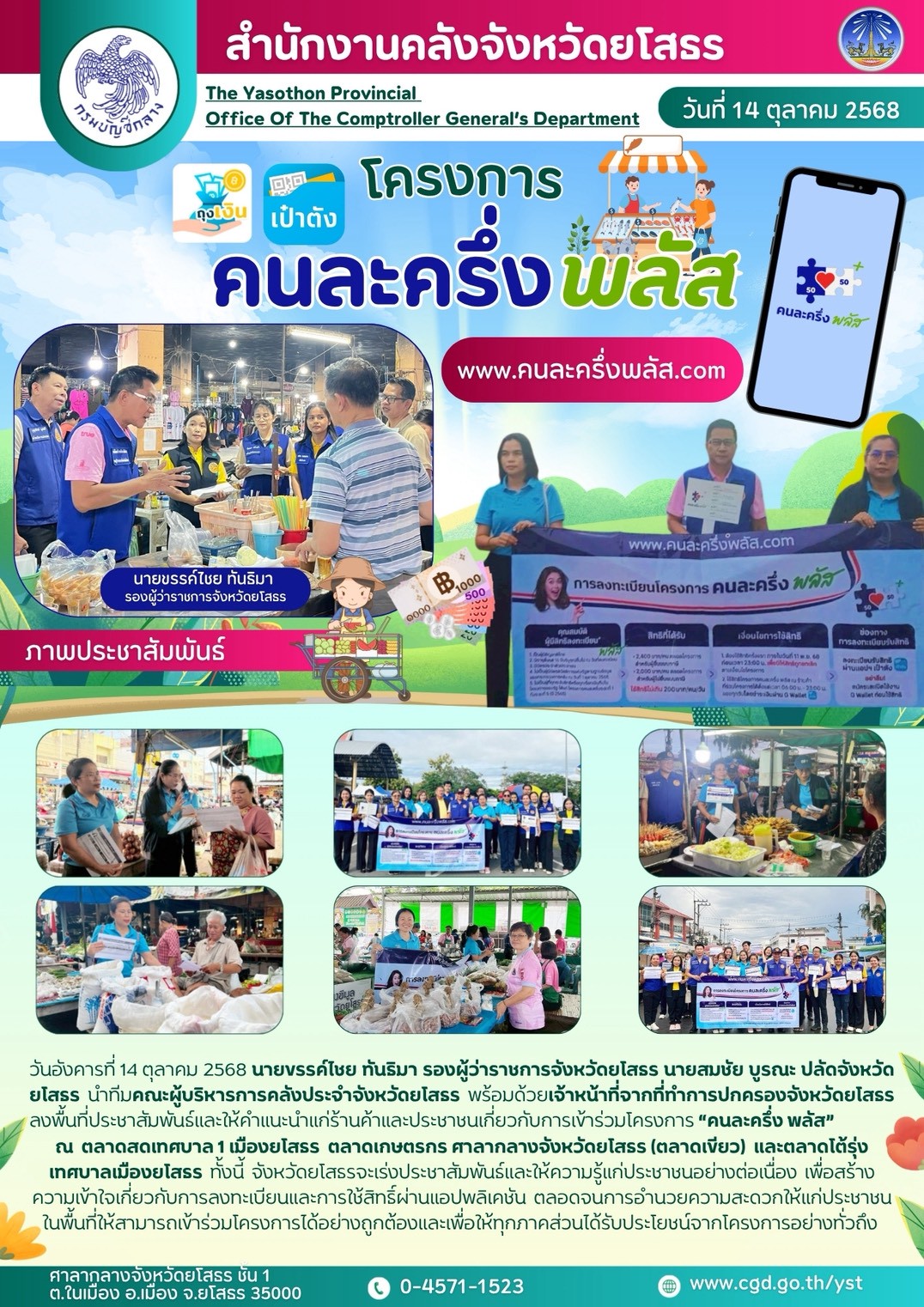 วันที่ 27 ต.ค. 2568 (08:16 น.)วันอังคารที่ 14 ตุลาคม 2568 นายขรรค์ไชย ทันธิมา รองผู้ว่าราชการจังหวัดยโสธร นายสมชัย บูรณะ ปลัดจังหวัดยโสธร นำทีมคณะผู้บริหารการคลังประจำจังหวัดยโสธร พร้อมด้วยเจ้าหน้าที่จากที่ทำการปกครองจังหวัดยโสธร ลงพื้นที่ประชาสัมพันธ์และให้คำแนะนำแก่ร้านค้าและประชาชนเกี่ยวกับการเข้าร่วมโครงการ “คนละครึ่ง พลัส” ณ ตลาดสดเทศบาล 1 เมืองยโสธร ตลาดเกษตรกร ศาลากลางจังหวัดยโสธร (ตลาดเขียว) และตลาดโต้รุ่งเทศบาลเมืองยโสธร ทั้งนี้ จังหวัดยโสธรจะเร่งประชาสัมพันธ์และให้ความรู้แก่ประชาชนอย่างต่อเนื่อง เพื่อสร้างความเข้าใจเกี่ยวกับการลงทะเบียนและการใช้สิทธิ์ผ่านแอปพลิเคชัน ตลอดจนการอำนวยความสะดวกให้แก่ประชาชนในพื้นที่ให้สามารถเข้าร่วมโครงการได้อย่างถูกต้องและเพื่อให้ทุกภาคส่วนได้รับประโยชน์จากโครงการอย่างทั่วถึง