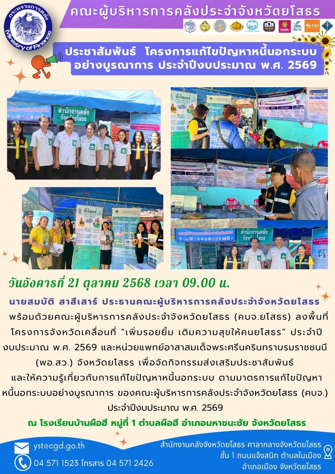 วันที่ 28 ต.ค. 2568 (16:27 น.)วันอังคารที่ 21 ตุลาคม 2568 เวลา 09.00 น.นายสมบัติ สาสีเสาร์ ประธานคณะผู้บริหารการคลังประจำจังหวัดยโสธร พร้อมด้วยคณะผู้บริหารการคลังประจำจังหวัดยโสธร (คบจ.ยโสธร) ลงพื้นที่โครงการจังหวัดเคลื่อนที่ “เพิ่มรอยยิ้ม เติมความสุขให้คนยโสธร” ประจำปีงบประมาณ พ.ศ. 2569 และหน่วยแพทย์อาสาสมเด็จพระศรีนครินทราบรมราชชนนี (พอ.สว.) จังหวัดยโสธร เพื่อจัดกิจกรรมส่งเสริมประชาสัมพันธ์ และให้ความรู้เกี่ยวกับการแก้ไขปัญหาหนี้นอกระบบ ตามมาตรการแก้ไขปัญหาหนี้นอกระบบอย่างบูรณาการ ของคณะผู้บริหารการคลังประจำจังหวัดยโสธร (คบจ.) ประจำปีงบประมาณ พ.ศ. 2569 ณ โรงเรียนบ้านผือฮี หมู่ที่ 1 ตำบลผือฮี อำเภอมหาชนะชัย จังหวัดยโสธร