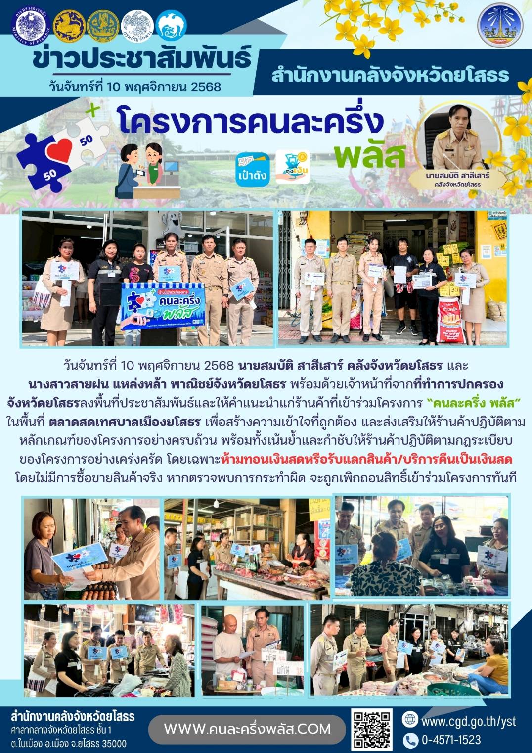 วันจันทร์ที่ 10 พฤศจิกายน 2568 นายสมบัติ สาสีเสาร์ คลังจังหวัดยโสธร และนางสาวสายฝน แหล่งหล้า พาณิชย์จังหวัดยโสธร พร้อมด้วยเจ้าหน้าที่จากที่ทำการปกครองจังหวัดยโสธรลงพื้นที่ประชาสัมพันธ์และให้คำแนะนำแก่ร้านค้าที่เข้าร่วมโครงการ “คนละครึ่ง พลัส” ในพื้นท