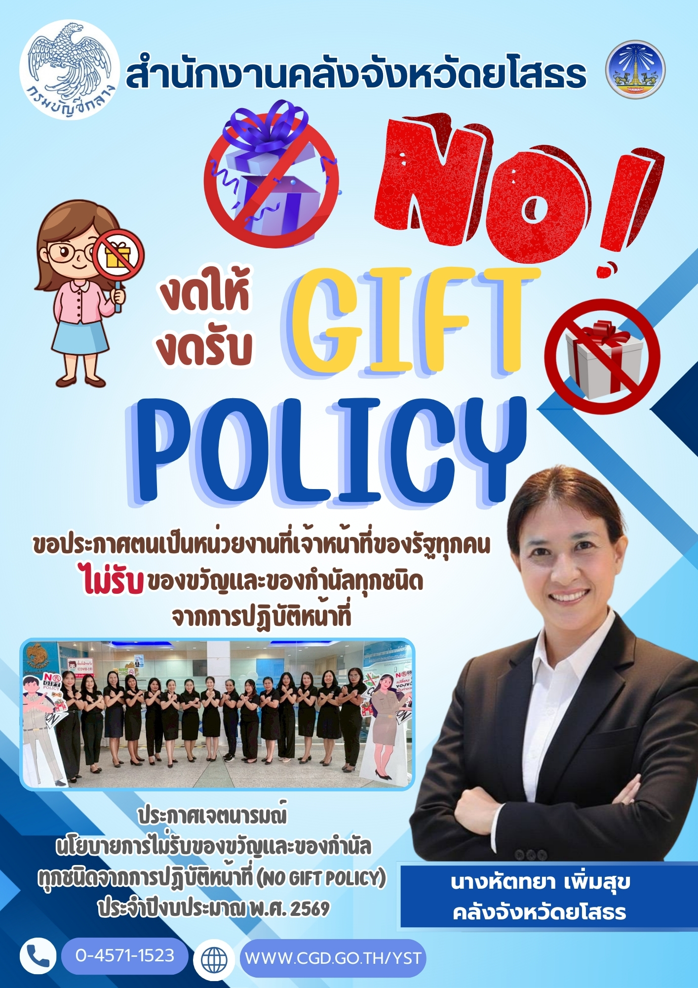 สำนักงานคลังจังหวัดยโสธร ประกาศเจตนารมณ์ นโยบายการไม่รับของขวัญและของกำนัลทุกชนิดจากการปฏิบัติหน้าที่ (No Gift Policy) ประจำปีงบประมาณ พ.ศ. 2569