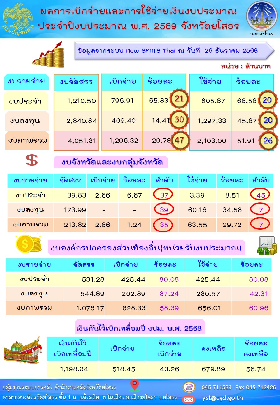สำนักงานคลังจังหวัดยโสธร ขอรายงานผลการเบิกจ่ายและใช้จ่ายงบประมาณ ประจำปีงบประมาณ พ.ศ. 2569 จังหวัดยโสธร ณ วันที่ 26 ธันวาคม 2568
