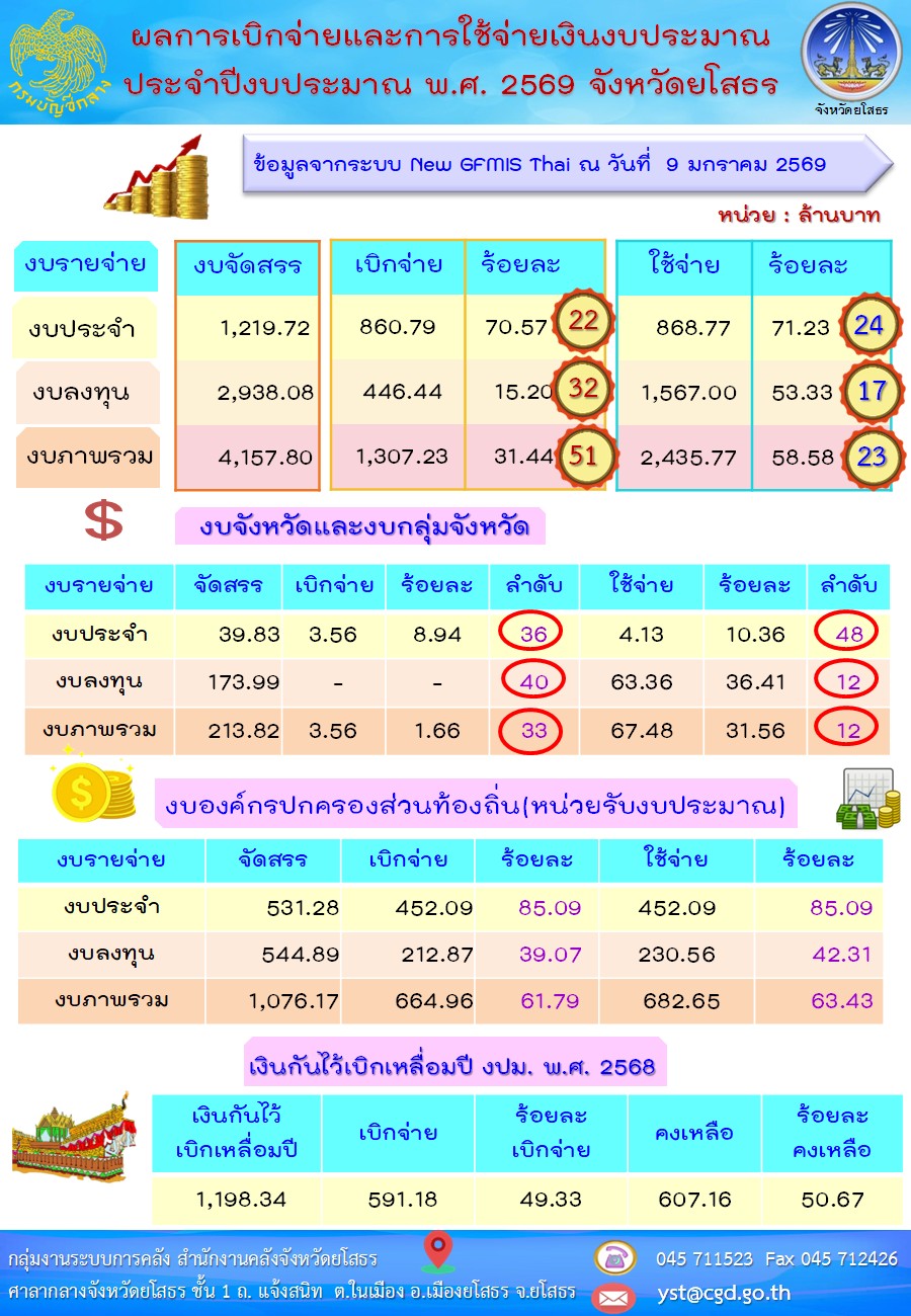 สำนักงานคลังจังหวัดยโสธร ขอรายงานผลการเบิกจ่ายและใช้จ่ายงบประมาณ ประจำปีงบประมาณ พ.ศ. 2569 จังหวัดยโสธร ณ วันที่ 9 มกราคม 2569