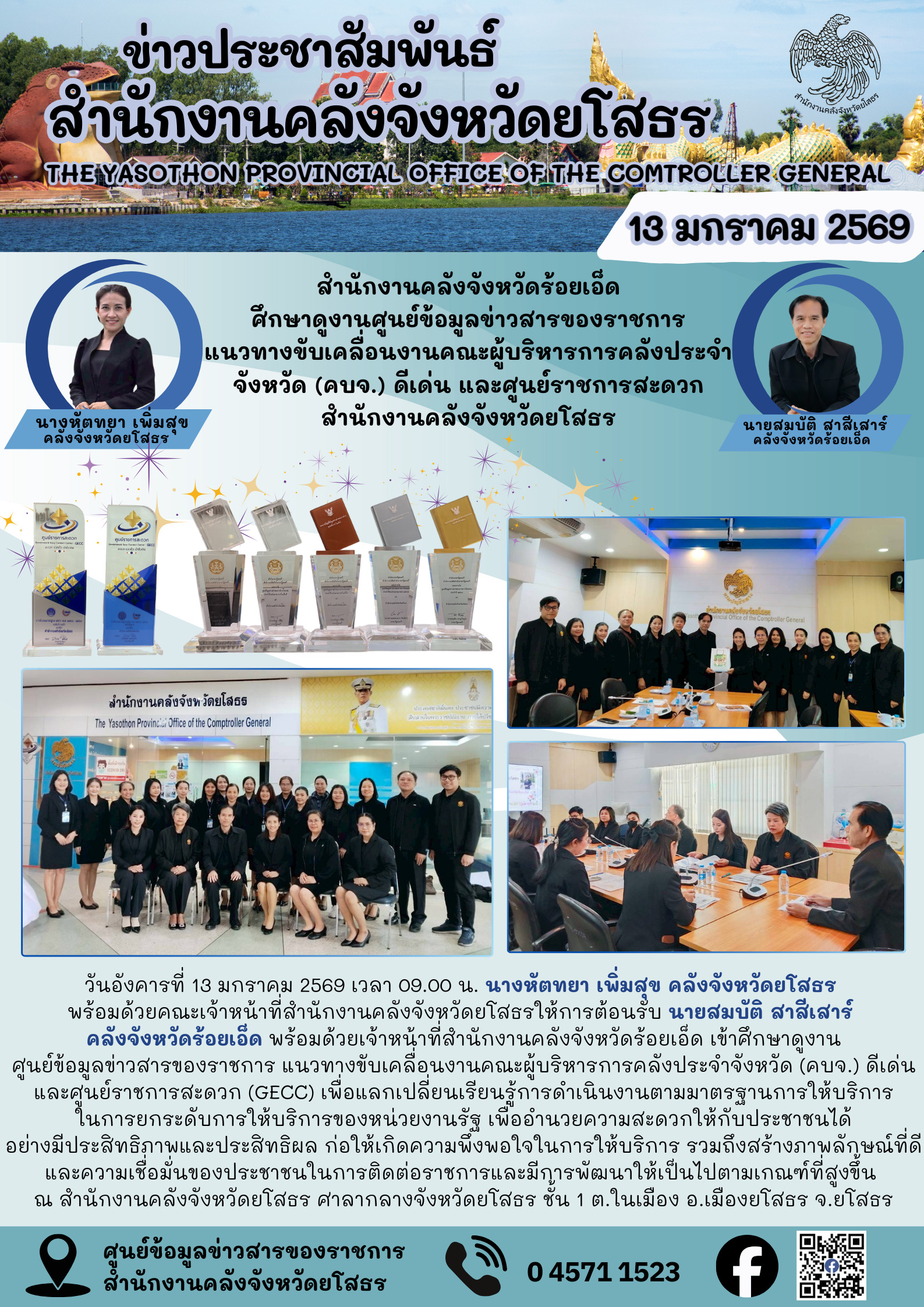 วันที่ 19 ม.ค. 2569 (10:57 น.)วันอังคารที่ 13 มกราคม 2569 เวลา 09.00 น. นางหัตทยา เพิ่มสุข คลังจังหวัดยโสธร พร้อมด้วยคณะเจ้าหน้าที่สำนักงานคลังจังหวัดยโสธรให้การต้อนรับ นายสมบัติ สาสีเสาร์ คลังจังหวัดร้อยเอ็ด พร้อมด้วยเจ้าหน้าที่สำนักงานคลังจังหวัดร้อยเอ็ด เข้าศึกษาดูงานศูนย์ข้อมูลข่าวสารของราชการ แนวทางขับเคลื่อนงานคณะผู้บริหารการคลังประจำจังหวัด (คบจ.) ดีเด่น และศูนย์ราชการสะดวก (GECC) เพื่อแลกเปลี่ยนเรียนรู้การดำเนินงานตามมาตรฐานการให้บริการในการยกระดับการให้บริการของหน่วยงานรัฐ เพื่ออำนวยความสะดวกให้กับประชาชนได้อย่างมีประสิทธิภาพและประสิทธิผล ก่อให้เกิดความพึงพอใจในการให้บริการ รวมถึงสร้างภาพลักษณ์ที่ดี และความเชื่อมั่นของประชาชนในการติดต่อราชการและมีการพัฒนาให้เป็นไปตามเกณฑ์ที่สูงขึ้น ณ สำนักงานคลังจังหวัดยโสธร ศาลากลางจังหวัดยโสธร ชั้น 1 ต.ในเมือง อ.เมืองยโสธร จ.ยโสธร