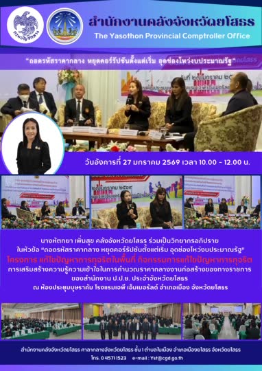 วันอังคารที่ 27 มกราคม 2569 เวลา 10.00 - 12.00 น. นางหัตทยา เพิ่มสุข คลังจังหวัดยโสธร ร่วมเป็นวิทยากรอภิปราย ในหัวข้อ “ถอดรหัสราคากลาง หยุดคอร์รัปชันตั้งแต่เริ่ม อุดช่องโหว่งบประมาณรัฐ” โครงการ แก้ไขปัญหาการทุจริตในพื้นที่ กิจกรรมการแก้ไขปัญหาการทุจร