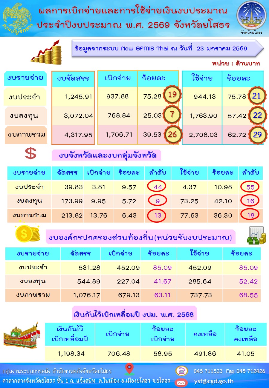 สำนักงานคลังจังหวัดยโสธร ขอรายงานผลการเบิกจ่ายและใช้จ่ายงบประมาณ ประจำปีงบประมาณ พ.ศ. 2569 จังหวัดยโสธร ณ วันที่ 23 มกราคม 2569