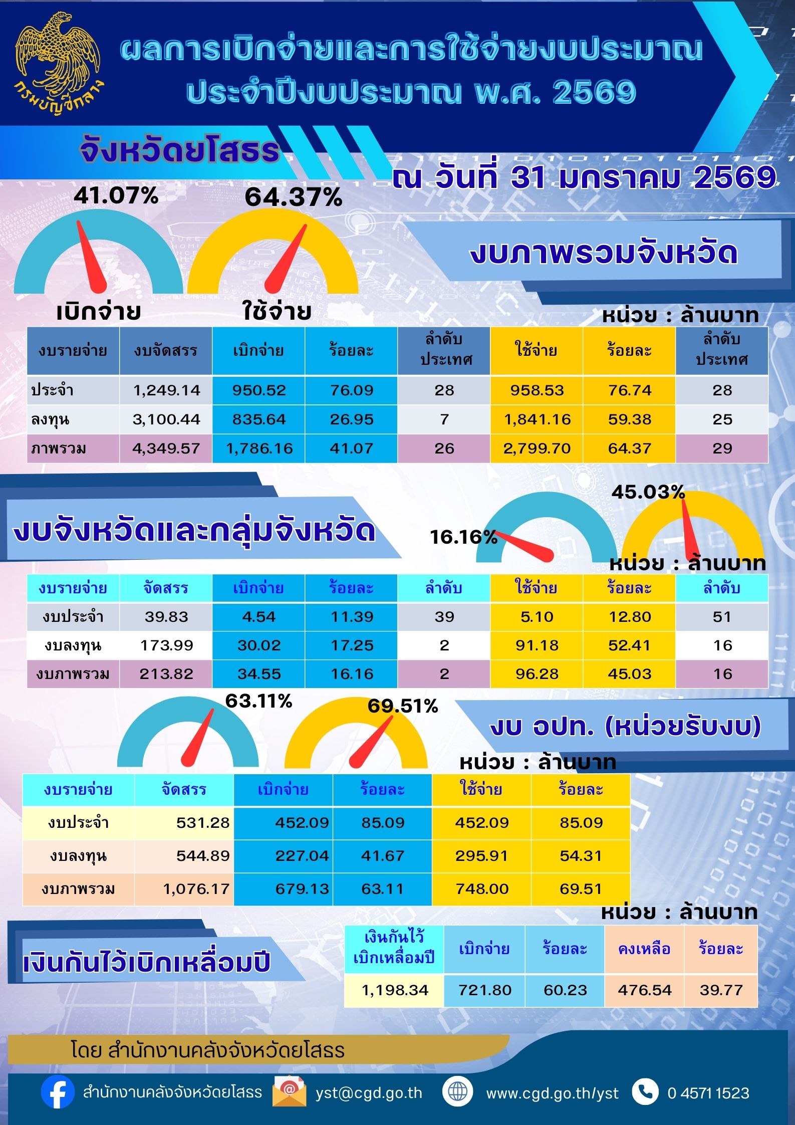 สำนักงานคลังจังหวัดยโสธร ขอรายงานผลการเบิกจ่ายและใช้จ่ายงบประมาณ ประจำปีงบประมาณ พ.ศ. 2569 จังหวัดยโสธร ณ วันที่ 31 มกราคม 2569
