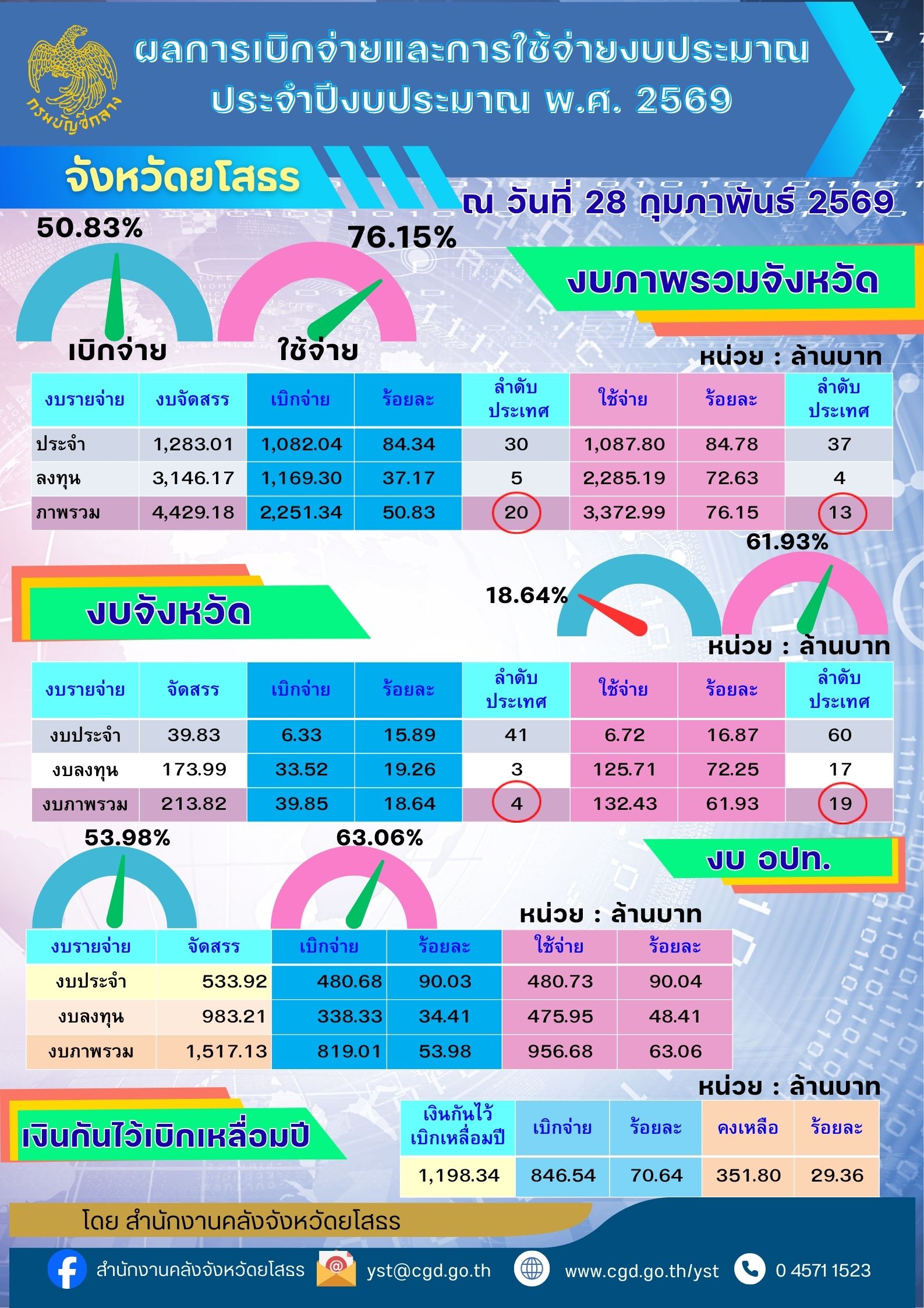 สำนักงานคลังจังหวัดยโสธร ขอรายงานผลการเบิกจ่ายและใช้จ่ายงบประมาณ ประจำปีงบประมาณ พ.ศ. 2569 จังหวัดยโสธร ณ วันที่ 28 กุมภาพันธ์ 2569