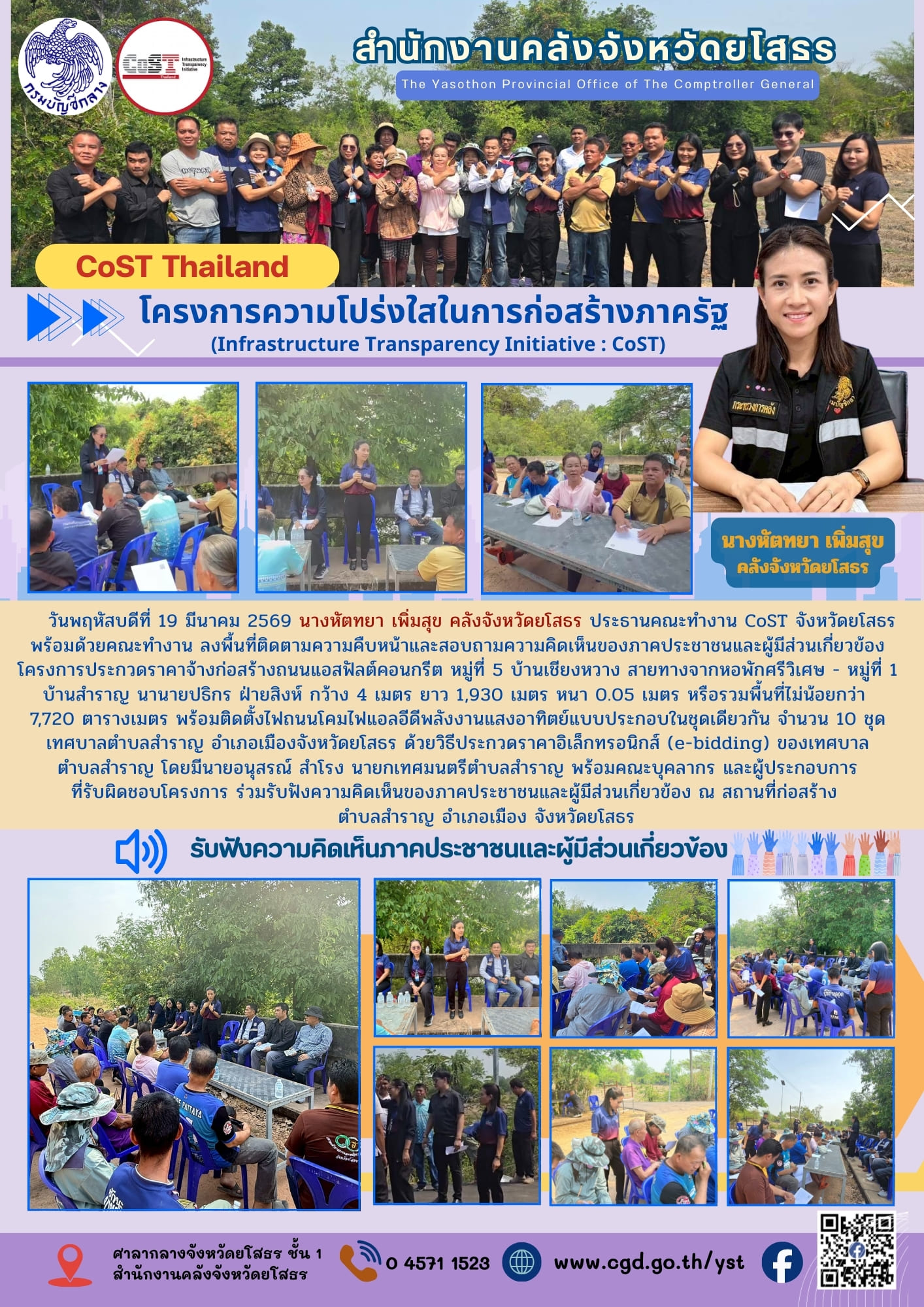 วันพฤหัสบดีที่ 19 มีนาคม 2569 นางหัตทยา เพิ่มสุข คลังจังหวัดยโสธร ประธานคณะทำงาน CoST จังหวัดยโสธร พร้อมด้วยคณะทำงาน ลงพื้นที่ติดตามความคืบหน้าและสอบถามความคิดเห็นของภาคประชาชนและผู้มีส่วนเกี่ยวข้อง โครงการประกวดราคาจ้างก่อสร้างถนนแอสฟัลต์คอนกรีต หมู