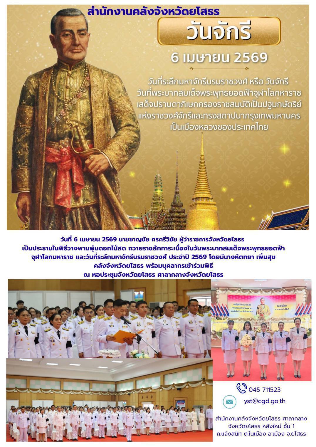 วันที่ 6 เมษายน 2569 นายชาญชัย ศรศรีวิชัย ผู้ว่าราชการจังหวัดยโสธร เป็นประธานวางพานพุ่มดอกไม้สด ถวายราชสักการะเนื่องในวันพระบาทสมเด็จพระพุทธยอดฟ้าจุฬาโลกมหาราช และวันที่ระลึกมหาจักรีบรมราชวงศ์ ประจำปี 2569 โดยมีนางหัตทยา เพิ่มสุข คลังจังหวัดยโสธร พร้