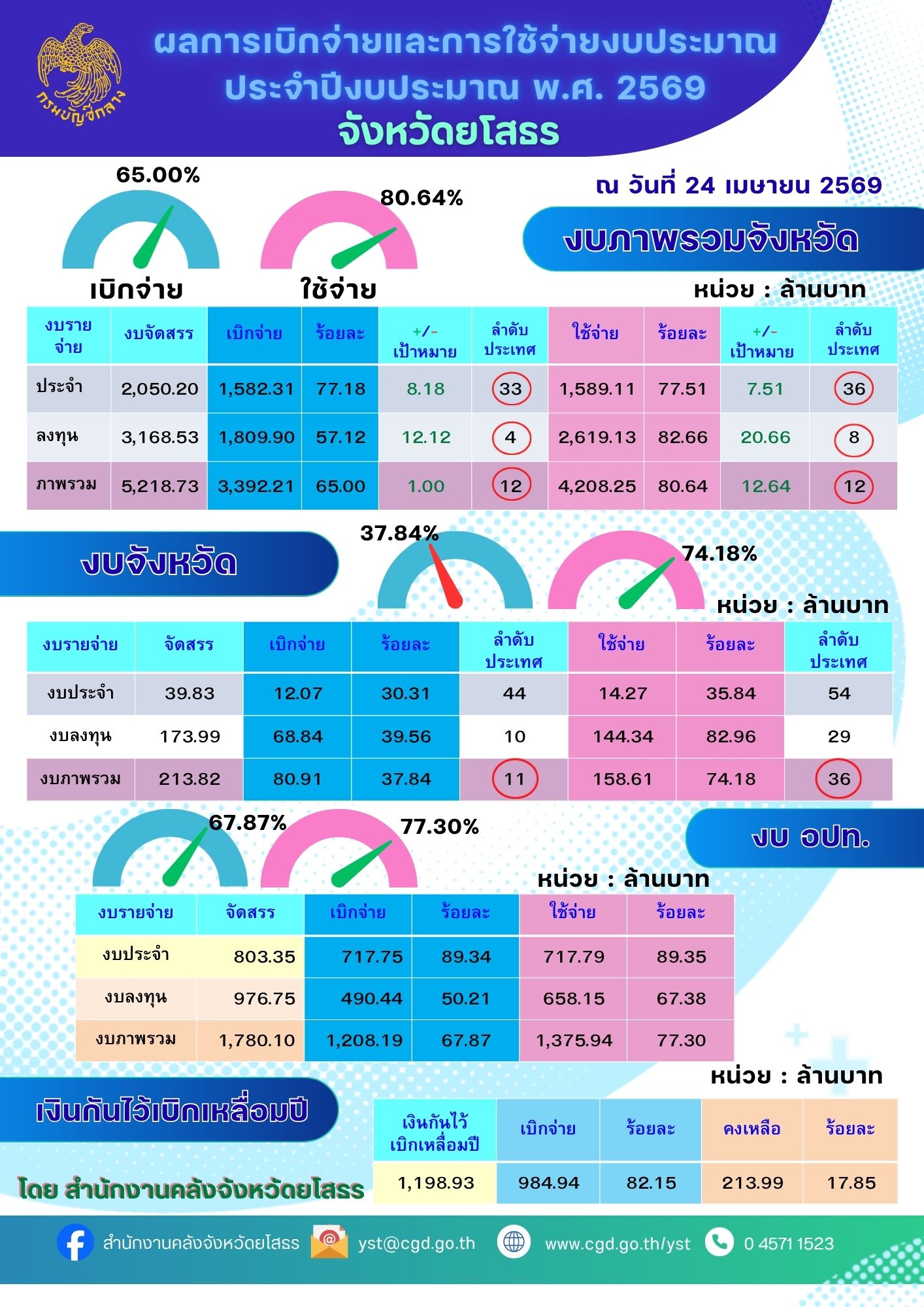 สำนักงานคลังจังหวัดยโสธร ขอรายงานผลการเบิกจ่ายและใช้จ่ายงบประมาณ ประจำปีงบประมาณ พ.ศ. 2569 จังหวัดยโสธร ณ วันที่ 24 เมษายน 2569