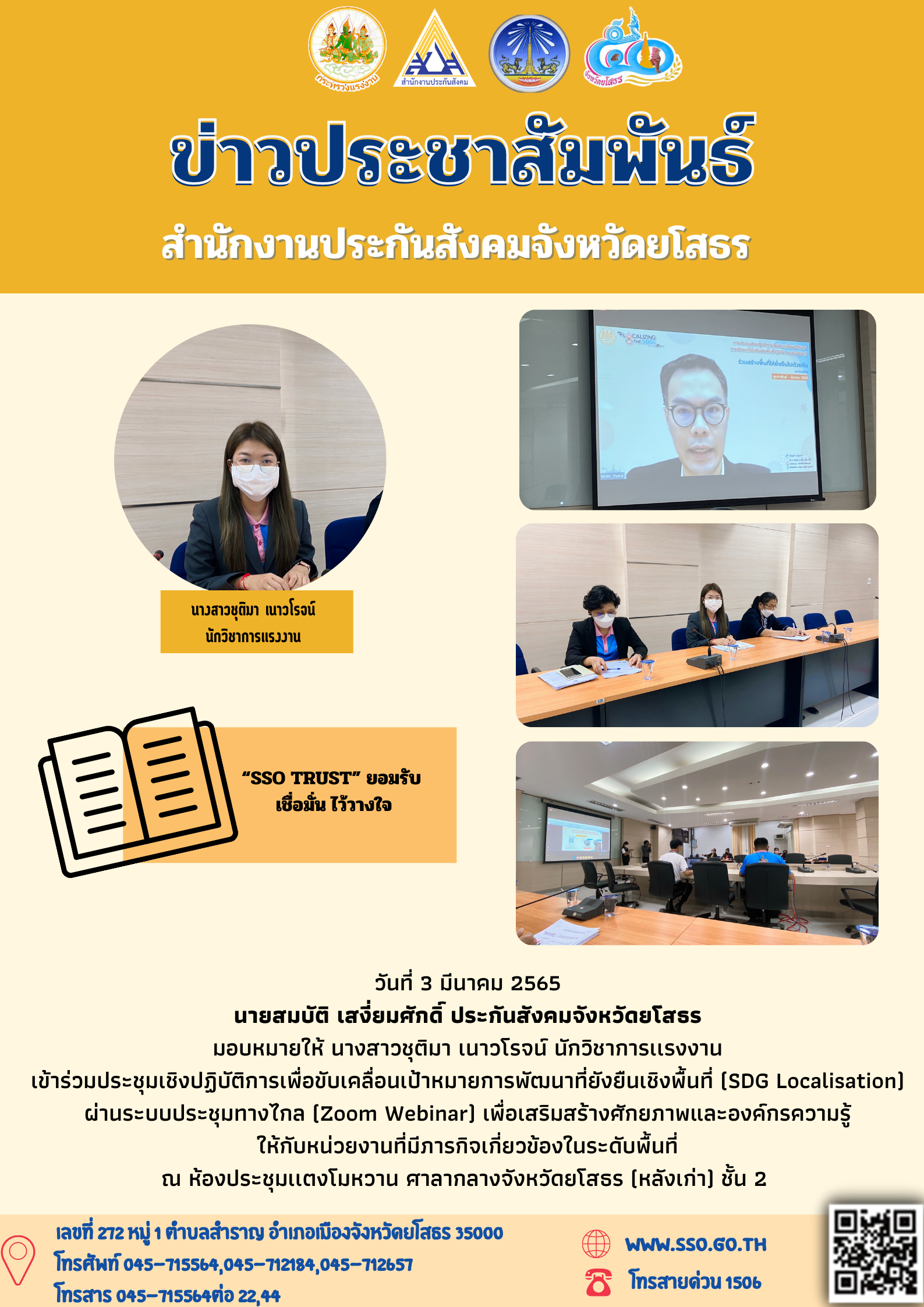 วันที่ 3 มีนาคม 2565 นายสมบัติ เสงี่ยมศักดิ์ ประกันสังคมจังหวัดยโสธร มอบหมายให้ นางสาวชุติมา เนาวโรจน์ นักวิชาการเเรงงาน เข้าร่วมประชุมเชิงปฏิบัติการเพื่อขับเคลื่อนเป้าหมายการพัฒนาที่ยังยืนเชิงพื้นที่ (SDG LOCALISATION) ผ่านระบบประชุมทางไกล (ZOOM WEB