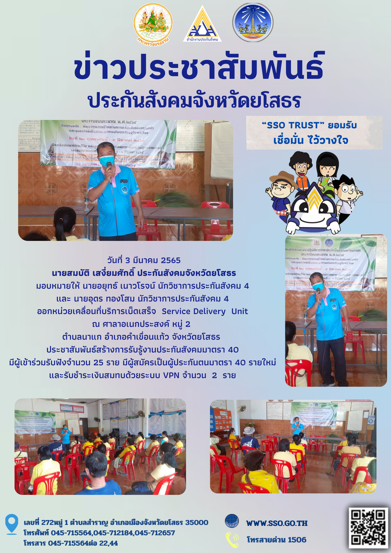 วันที่ 3 มีนาคม 2565 นายสมบัติ เสงี่ยมศักดิ์ ประกันสังคมจังหวัดยโสธร มอบหมายให้ นายอยุทธ์ เนาวโรจน์ นักวิชาการประกันสังคม 4 และ นายอุดร ทองโสม นักวิชาการประกันสังคม 4 ออกหน่วยเคลื่อนที่บริการเบ็ดเสร็จ SERVICE DELIVERY UNIT