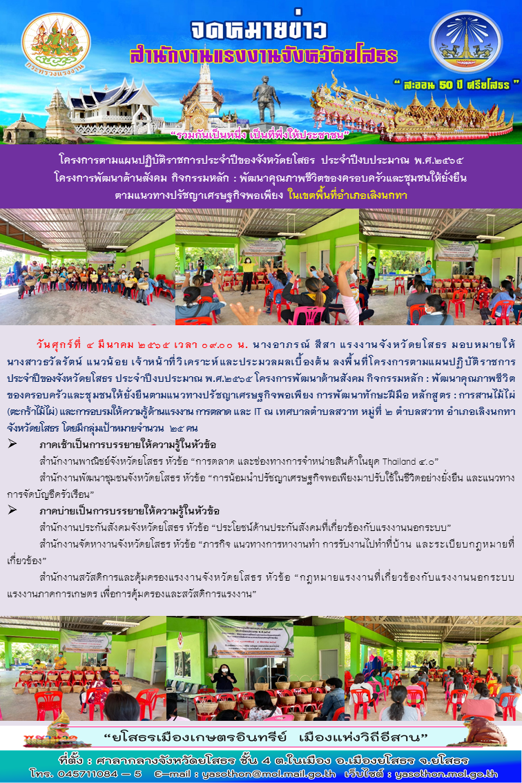 สำนักงานแรงงานจังหวัดยโสธร ลงพื้นที่จัดโครงการตามเเผนปฏิบัติราชการประจำปีของจังหวัดยโสธร ประจำปีงบประมาณ พ.ศ.2565 ในเขตอำเภอเลิงนกทา