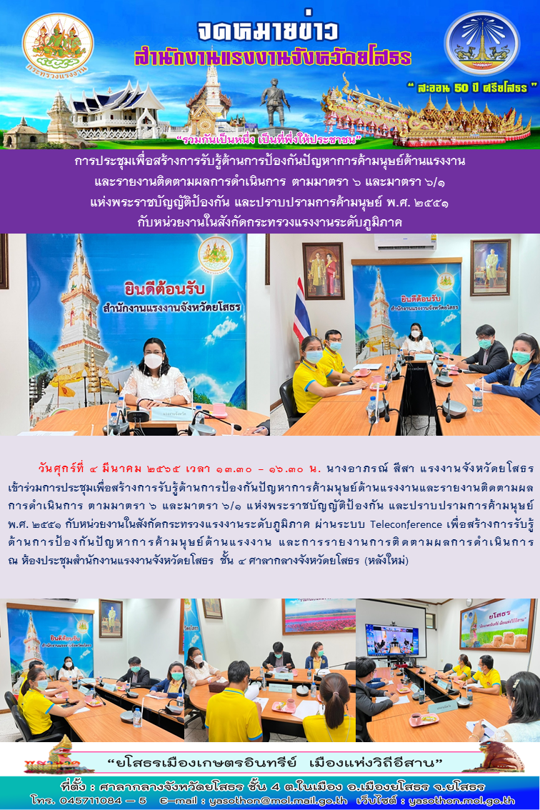 สำนักงานแรงงานจังหวัดยโสธร เข้าร่มประชุมเพื่อสร้างการรับรู้ด้านการป้องกันปัญหาการค้ามนุษย์ด้านแรงงาน และรายงานติดตามผลการดำเนินการ ตามมาตรา 6 และมาตรา 6/1 แห่งพระราชบัญญัติป้องกันและปราบปรามการค้ามนุษย์ พ.ศ.2551