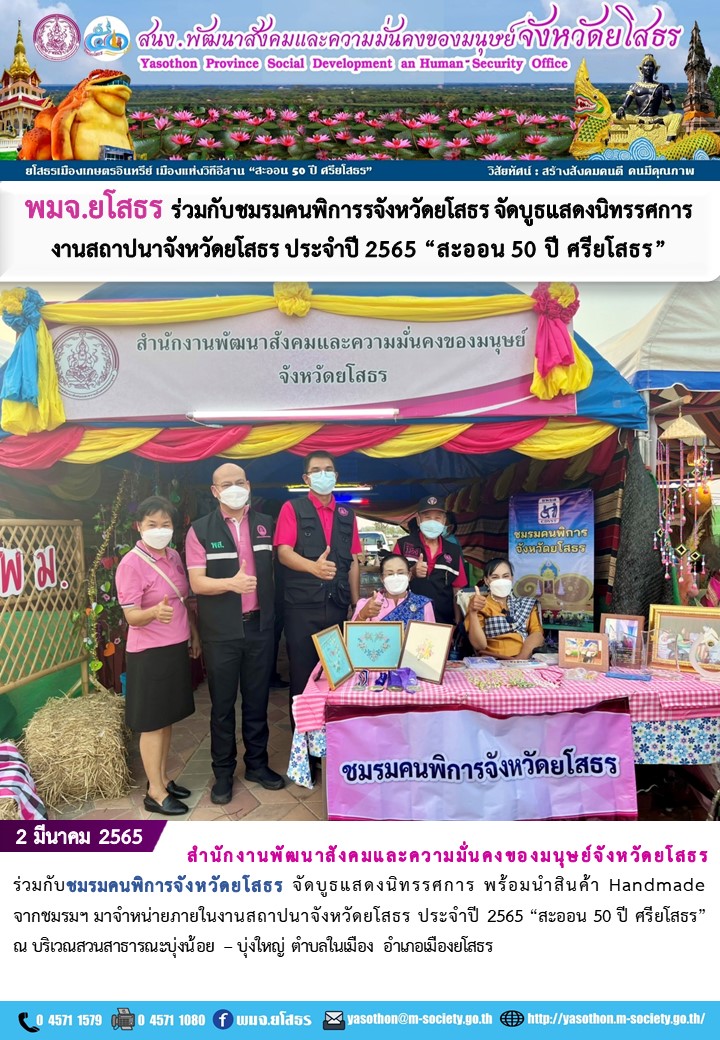 พมจ.ยโสธร ร่วมกับชมรมคนพิการจังหวัดยโสธร จัดบูธแสดงนิทรรศการงานสถาปนาจังหวัดยโสธร ประจำปี 2565 "สะออน 50 ปี ศรียโสธร" (2 มีนาคม 2565)