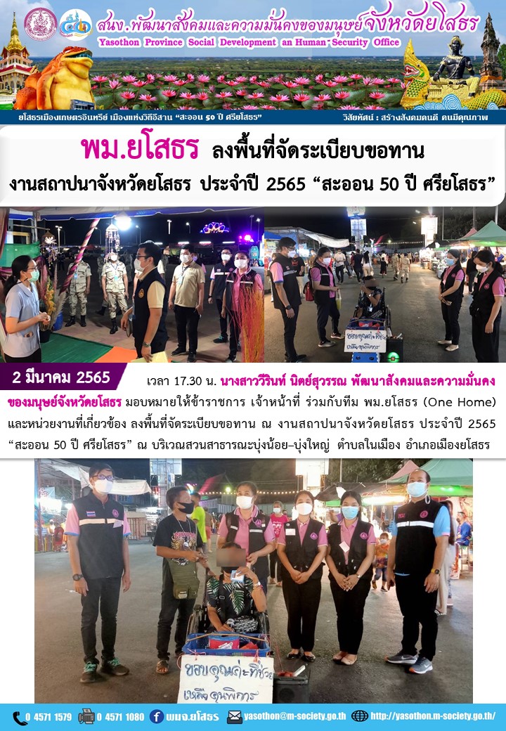พม.ยโสธร ลงพื้นที่จัดระเบียบขอทาน งานสถาปนาจังหวัดยโสธร ประจำปี 2565 "สะออน 50 ปี ศรียโสธร" (2 มีนาคม 2565)