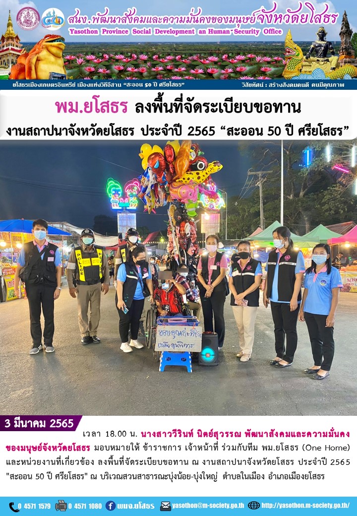 พม.ยโสธร ลงพื้นที่จัดระเบียบขอทาน งานสถาปนาจังหวัดยโสธร ประจำปี 2565 "สะออน 50 ปี ศรียโสธร" (3 มีนาคม 2565)