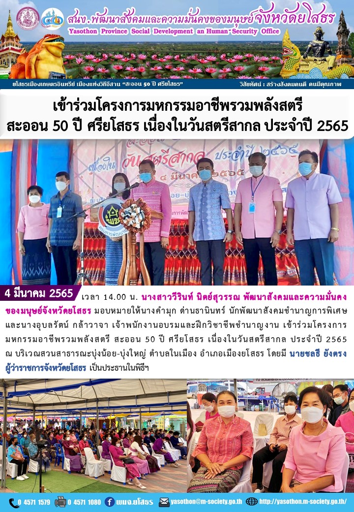 เข้าร่วมโครงการมหกรรมอาชีพรวมพลังสตรีสะออน 50 ศรียโสธร เนื่องในวันสตรีสากล ประจำปี 2565 (4 มีนาคม 2565)