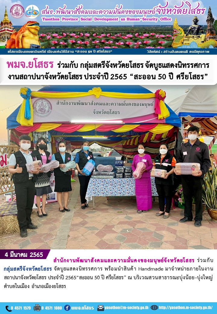 พมจ.ยโสธร ร่วมกับ กลุ่มสตรีจังหวัดยโสธร จัดบูธแสดงนิทรรศการงานสถาปนาจังหวัดยโสธร ประจำปี 2565 "สะออน 50 ปี ศรียโสธร" (4 มีนาคม 2565)