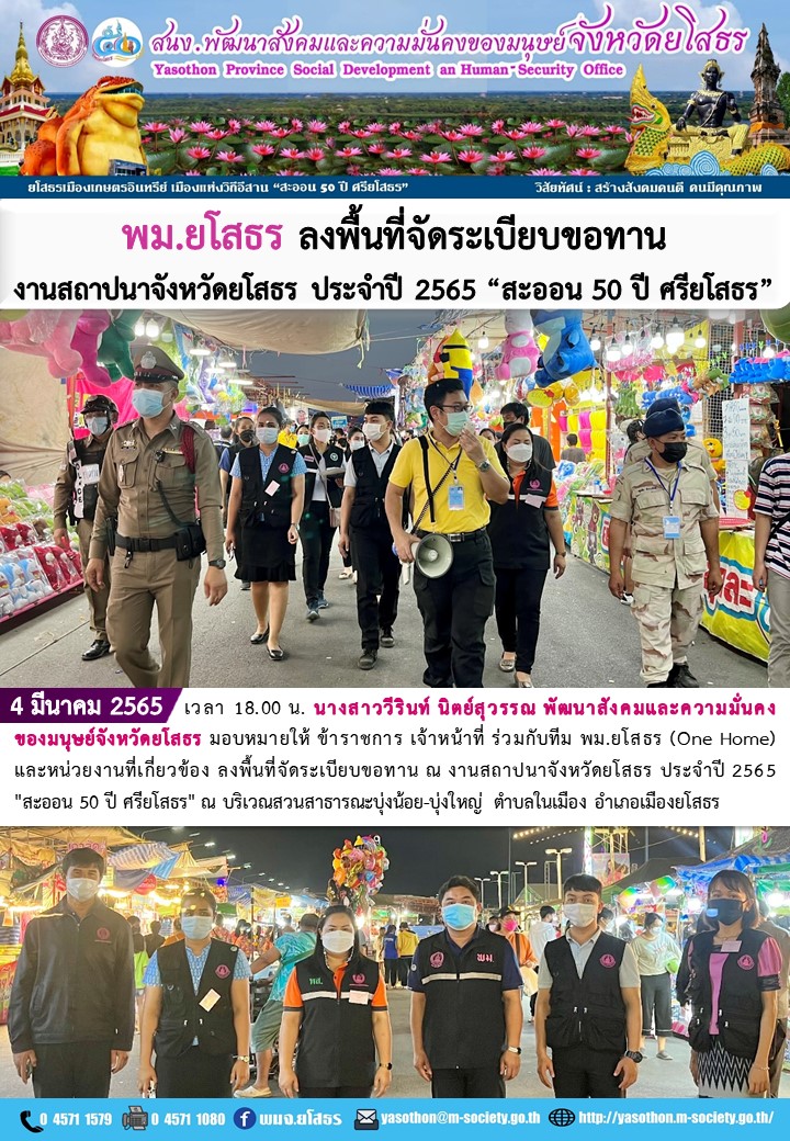 พม.ยโสธร ลงพื้นที่จัดระเบียบขอทาน งานสถาปนาจังหวัดยโสธร ประจำปี 2565 "สะออน 50 ปี ศรียโสธร" (4 มีนาคม 2565)