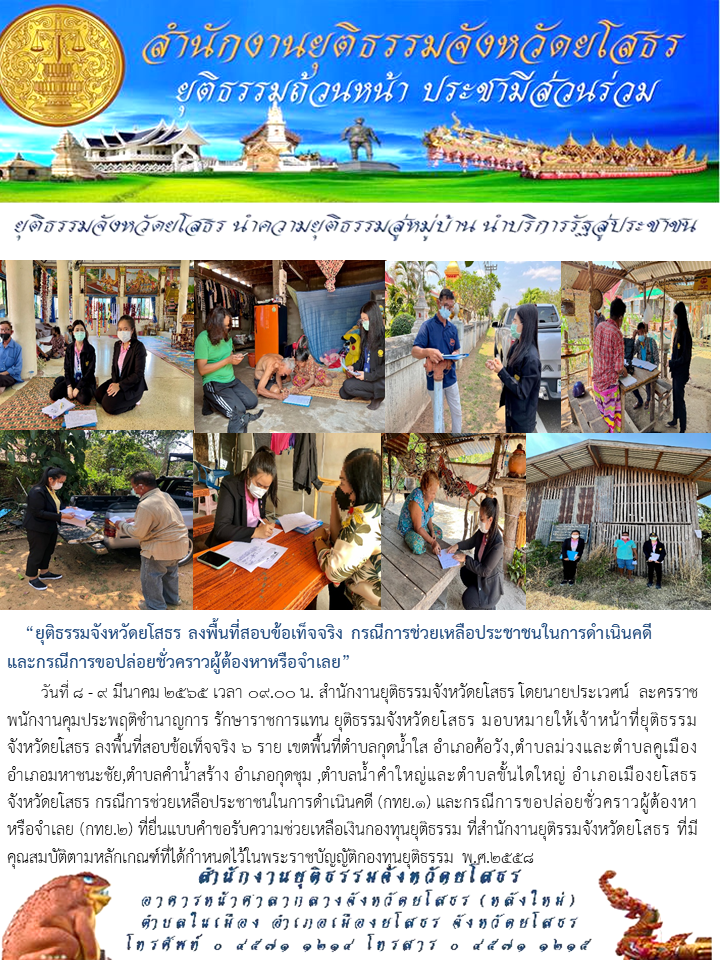 วันที่ 9 มี.ค. 2565 (17:14 น.)วันที่ ๘ - ๙ มีนาคม ๒๕๖๕ เวลา ๐๙.๐๐ น. สำนักงานยุติธรรมจังหวัดยโสธร โดยนายประเวศน์ ละครราช พนักงานคุมประพฤติชำนาญการ รักษาราชการแทน ยุติธรรมจังหวัดยโสธร มอบหมายให้เจ้าหน้าที่ยุติธรรมจังหวัดยโสธร ลงพื้นที่สอบข้อเท็จจริง ๖ ราย เขตพื้นที่ตำบลกุดน้ำใส อำเภอค้อวัง,ตำบลม่วงและตำบลคูเมือง อำเภอมหาชนะชัย,ตำบลคำน้ำสร้าง อำเภอกุดชุม ,ตำบลน้ำคำใหญ่และตำบลขั้นไดใหญ่ อำเภอเมืองยโสธร จังหวัดยโสธร กรณีการช่วยเหลือประชาชนในการดำเนินคดี (กทย.๑) และกรณีการขอปล่อยชั่วคราวผู้ต้องหาหรือจำเลย (กทย.๒) ที่ยื่นแบบคำขอรับความช่วยเหลือเงินกองทุนยุติธรรม ที่สำนักงานยุติรรมจังหวัดยโสธร ที่มีคุณสมบัติตามหลักเกณฑ์ที่ได้กำหนดไว้ในพระราชบัญญัติกองทุนยุติธรรม พ.ศ.๒๕๕๘