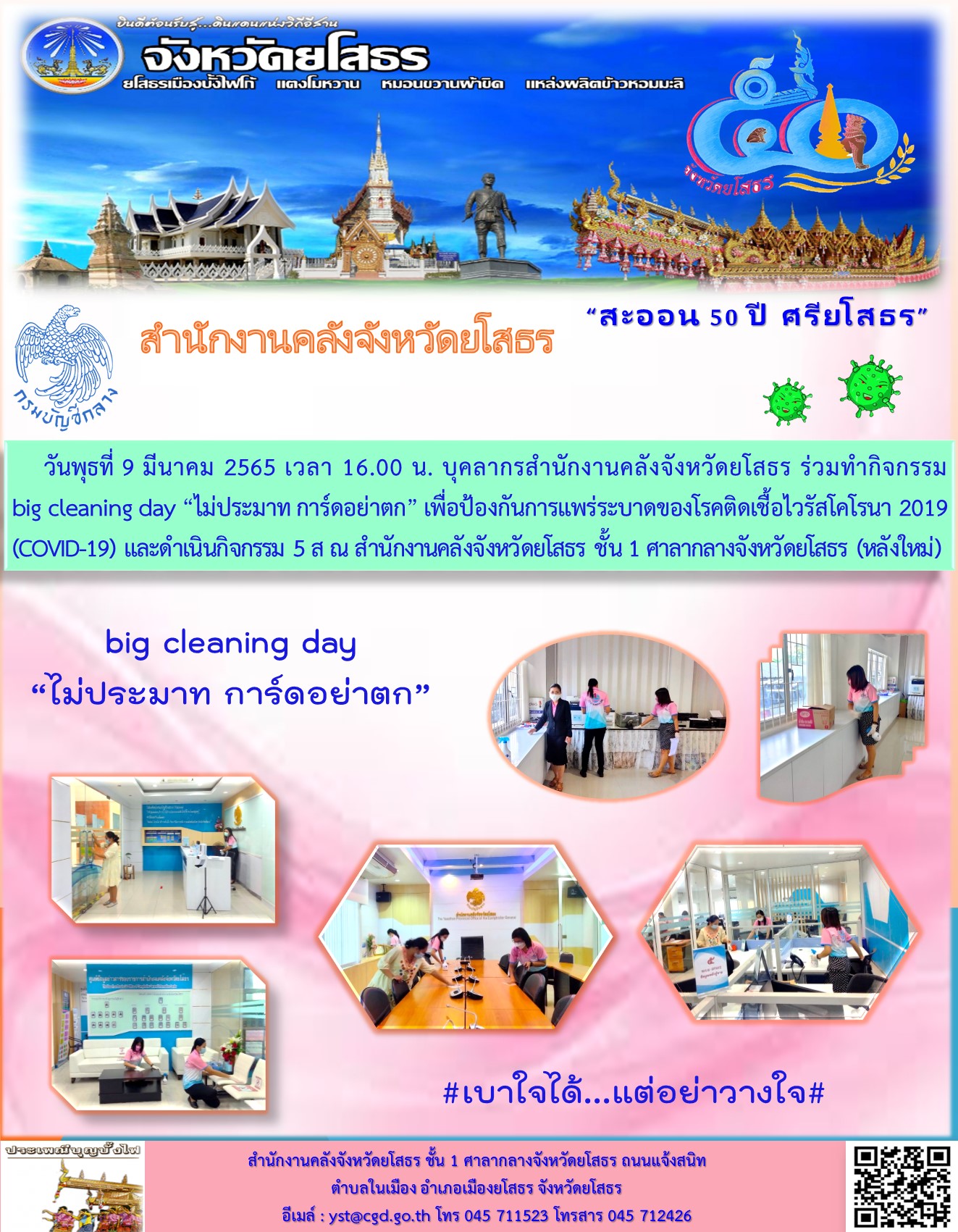 วันพุธที่ 9 มีนาคม 2565 เวลา 16.00 น. บุคลากรสำนักงานคลังจังหวัดยโสธร ร่วมทำกิจกรรม big cleaning day “ไม่ประมาท การ์ดอย่าตก” เพื่อป้องกันการแพร่ระบาดของโรคติดเชื้อไวรัสโคโรนา 2019 (COVID-19) และดำเนินกิจกรรม 5 ส ณ สำนักงานคลังจังหวัดยโสธร ชั้น 1 ศาลา