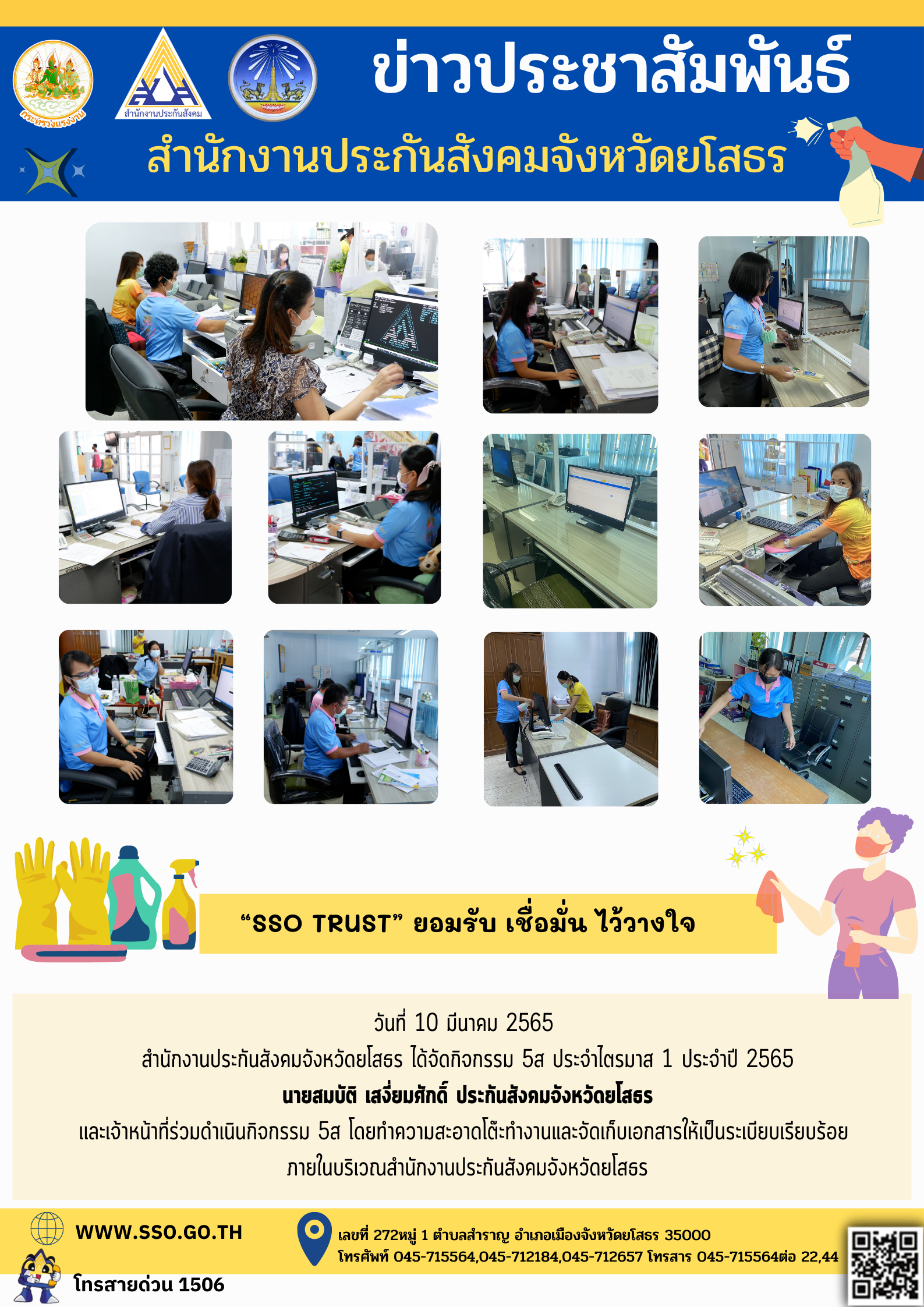 วันที่ 10 มีนาคม 2565 สำนักงานประกันสังคมจังหวัดยโสธร ได้จัดกิจกรรม 5ส ประจำไตรมาส 1 ประจำปี 2565 นายสมบัติ เสงี่ยมศักดิ์ ประกันสังคมจังหวัดยโสธร เเละเจ้าหน้าที่ร่วมดำเนินกิจกรรม 5ส โดยทำความสะอาดโต๊ะทำงานและจัดเก็บเอกสารให้เป็นระเบียบเรียบร้อย ภายใน