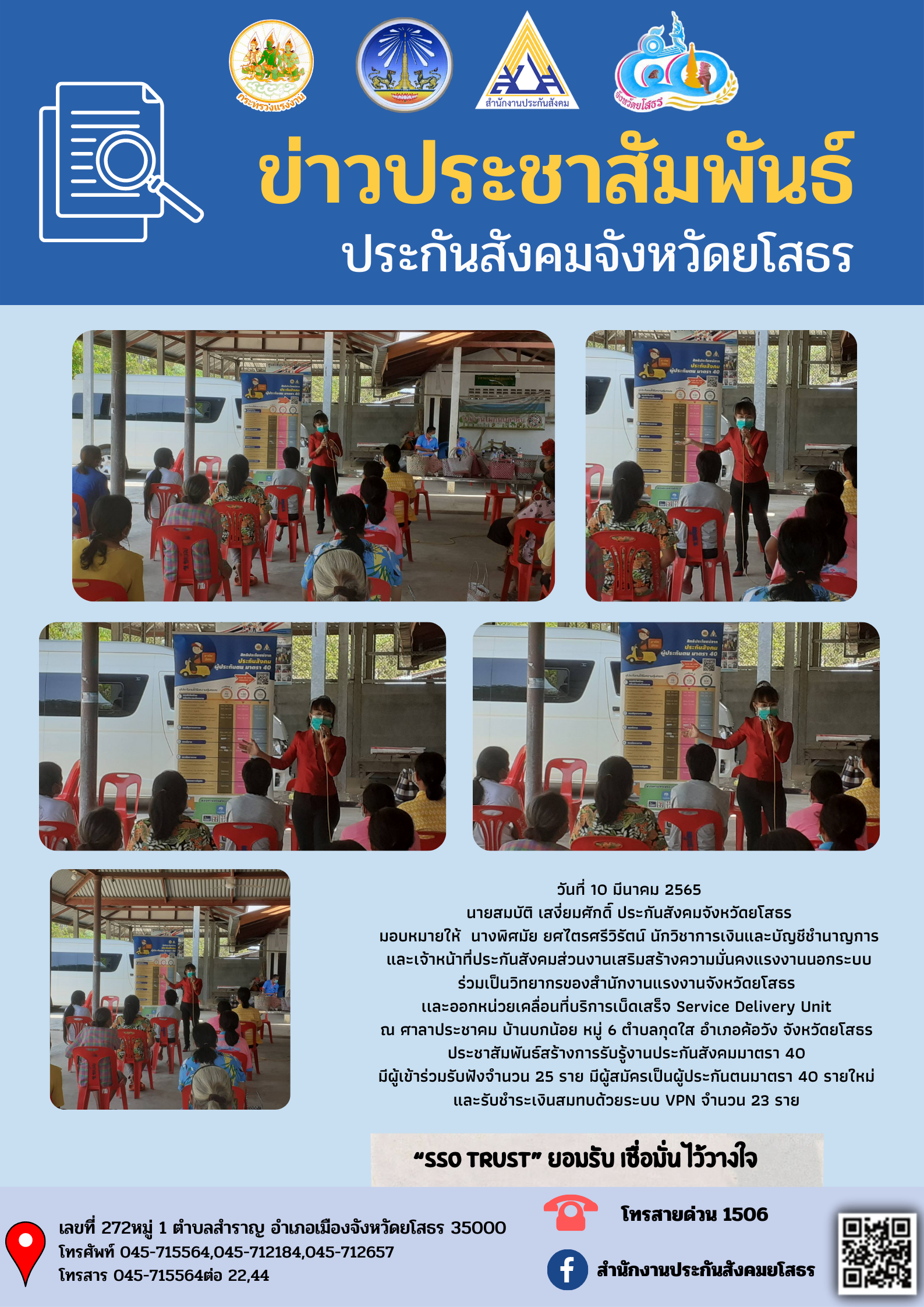 วันที่ 10 มีนาคม 2565 นายสมบัติ เสงี่ยมศักดิ์ ประกันสังคมจังหวัดยโสธร มอบหมายให้ เจ้าหน้าที่ ออกหน่วยเคลื่อนที่บริการเบ็ดเสร็จ SERVICE DELIVERY UNIT