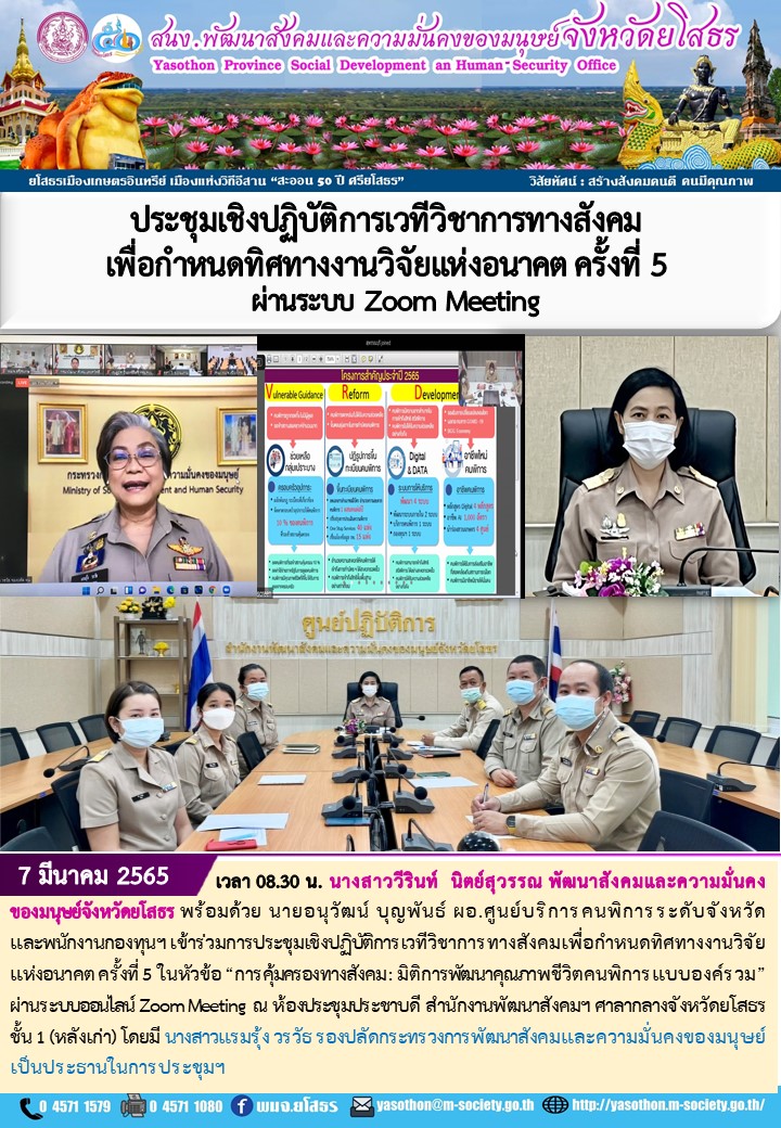 วันที่ 11 มี.ค. 2565 (08:36 น.)วันที่ 7 มีนาคม 2565 เวลา 08.30 น. นางสาววีรินท์ นิตย์สุวรรณ พัฒนาสังคมและความมั่นคงของมนุษย์จังหวัดยโสธร พร้อมด้วย นายอนุวัฒน์ บุญพันธ์ ผอ.ศูนย์บริการคนพิการระดับจังหวัด และพนักงานกองทุนฯ เข้าร่วมการประชุมเชิงปฏิบัติการเวทีวิชาการทงสังคมเพื่อกำหนดทิศทางงานวิจัยแห่งอนาคต ครั้งที่ 5 ในหัวข้อ "การคุ้มครองทางสังคม: มิติการพัฒนาคุณภาพชีวิตคนพิการ แบบองค์รวม"ผ่านร ะบบออนไลน์ Zo๐m Meeting ณ ห้องประชุมปร ะชาบดี สำนักงานพัฒนาสังคมฯ ศาลากลางจั งหวัดยโสธรชั้น 1 (หลังเก่า) โดยมี นางสาวแรมรุ้ง วรวัธ รองปลัดกระทรวงกรพัฒาสังคมและความมั่นคงของมนุษย์เป็นประธานในการประชุมฯ