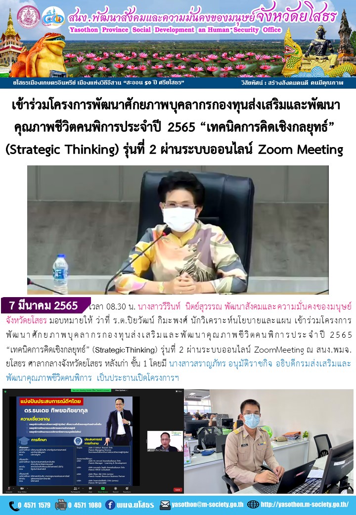 เข้าร่วมโครงการพัฒนาศักยภาพบุคลากรกองทุนส่งเสริมและพัฒนาคุณภาพชีวิตคนพิการประจำปี 2565 "เทคนิคการคิดเชิงกลยุทธ์" (StrategicThinking) รุ่นที่ 2 (7 มีนาคม 2565)