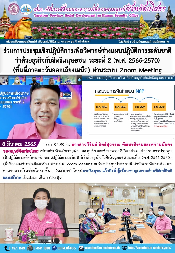 วันที่ 11 มี.ค. 2565 (08:41 น.)วันที่ 8 มีนาคม 2565 เวลา 09.00 น. นางสาววีรินท์ นิตย์สุวรรณ พัฒนาสังคมและความมั่นคงของมนุษย์จังหวัดยโสธร พร้อมด้วยหัวหน้ากลุ่ม/ฝ่าย ผอ.ศูนย์ฯ และข้าราชการที่เกี่ยวข้อง เข้าร่วมการประชุมเชิงปฎิบัติการเพื่อวิพากษ์ร่างแผนปฎิบัติการระดับชาติว่าด้วยธุรกิจกับสิทธิมนุษยชน ระยะที่ 2 (พ.ศ. 2566-2570) (พื้นที่ภาคตะวันออกเฉียงเหนือ) ผ่านระบบ Zoom Meeting ณ ห้องประชุมประชาบดี สำนักงานพัฒนาสังคมฯ ศาลากลางจังหวัดยโสธร ชั้น 1 (หลังเก่า) โดยมีนายธีรยุทธ แก้วสิงห์ ผู้เชี่ยวชาญเฉพาะด้านพิทักษ์สิทธิและเสรีภาพ เป็นประธานในการประชุมฯ