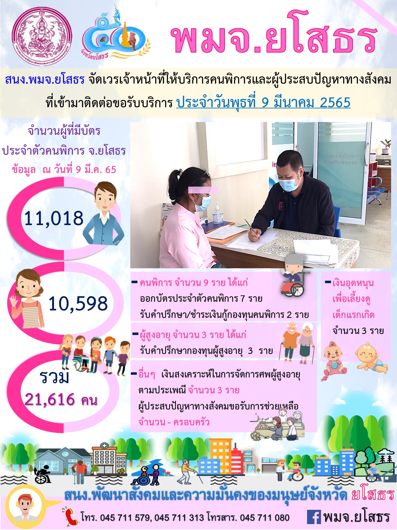 สนง.พมจ.ยโสธร จัดเวรเจ้าหน้าที่ให้บริการคนพิการและผู้ประสบปัญหาทางสังคม ที่เข้ามาติดต่อขอรับบริการ (9 มีนาคม 2565)