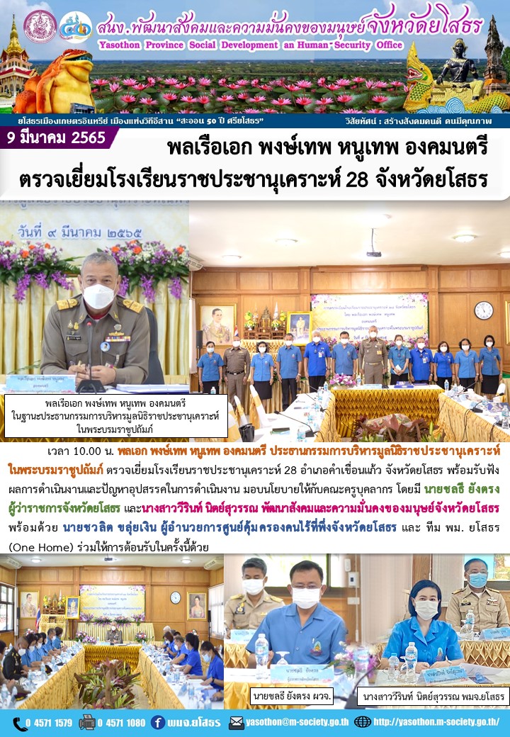 วันที่ 11 มี.ค. 2565 (08:47 น.)วันที่ 9 มีนาคม 2565 เวลา 10.00 น. พลเอก พงษ์เทพ หนูเทพ องคมนตรี ประธานกรรมการบริหารมูลนิธิราชประชานุเคราะห์ในพระบรมราชูปถัมภ์ ตรวจเยี่ยมโรงเรียนราชประชานุเคราะห์ 28 อำเภอคำเขื่อนแก้ว จังหวัดยโสธร พร้อมรับฟังผลการดำเนินงาน ปัญหาอุปสรรคในการดำเนินงาน และให้ข้อเสนอแนะกับคณะครูบุคลากรโรงเรียนฯ โดยมี นายชลธี ยังตรง ผู้ว่าราชการจังหวัดยโสธร พร้อมคณะกรรมการมูลนิธิราชประชานุเคราะห์ประจำจังหวัด และหัวหน้าส่วนราชการ ร่วมให้การต้อนรับ