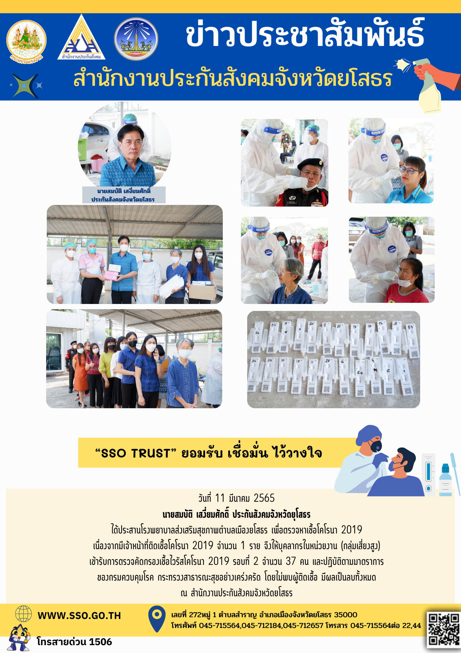 วันที่ 11 มีนาคม 2565 นายสมบัติ เสงี่ยมศักดิ์ ประกันสังคมจังหวัดยโสธร และเจ้าหน้าที่ประกันสังคมจังหวัดยโสธร จำนวน 37 คน เข้ารับการตรวจคัดกรองเชื้อไวรัสโคโรนา 2019 รอบที่ 2