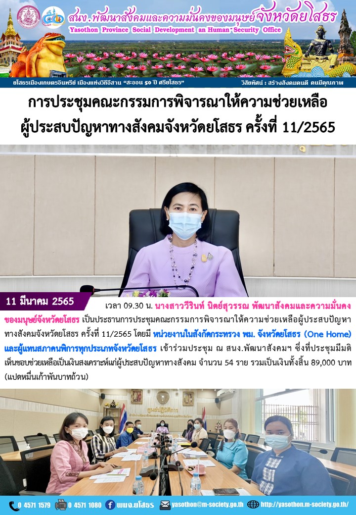 ประชุมคณะกรรมการพิจารณาให้ความช่วยเหลือผู้ประสบปัญหาทางสังคมจังหวัดยโสธร ครั้งที่ 11/2565 (11 มีนาคม 2565)