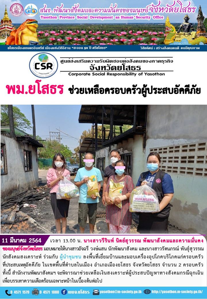 พม.ยโสธร ช่วยเหลือครอบครัวผู้ประสบอัคคีภัย (11 มีนาคม 2565)