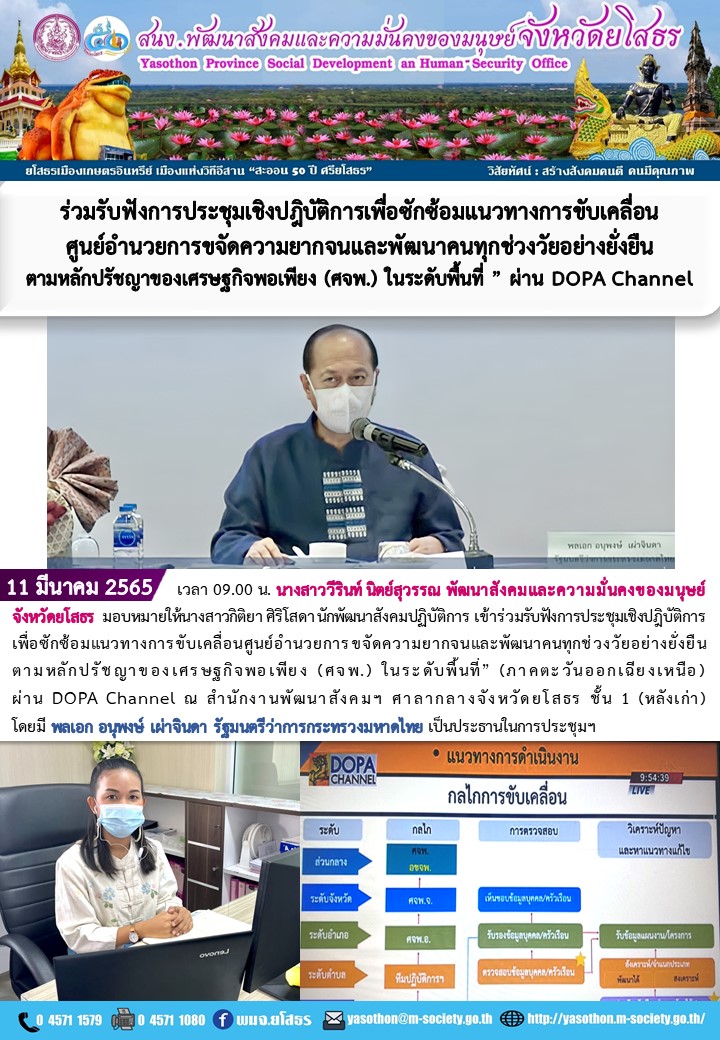 ร่วมรับฟังการประชุมเชิงปฎิบัติการเพื่อซักซ้อมแนวทางการขับเคลื่อนศูนย์อำนวยการขจัดความยากจนและพัฒนาคนทุกช่วงวัยอย่างยั่งยืนตามหลักปรัชญาของเศรษฐกิจพอพียยง (ศจพ.) ในระดับพื้นที่” (11 มีนาคม 2565)