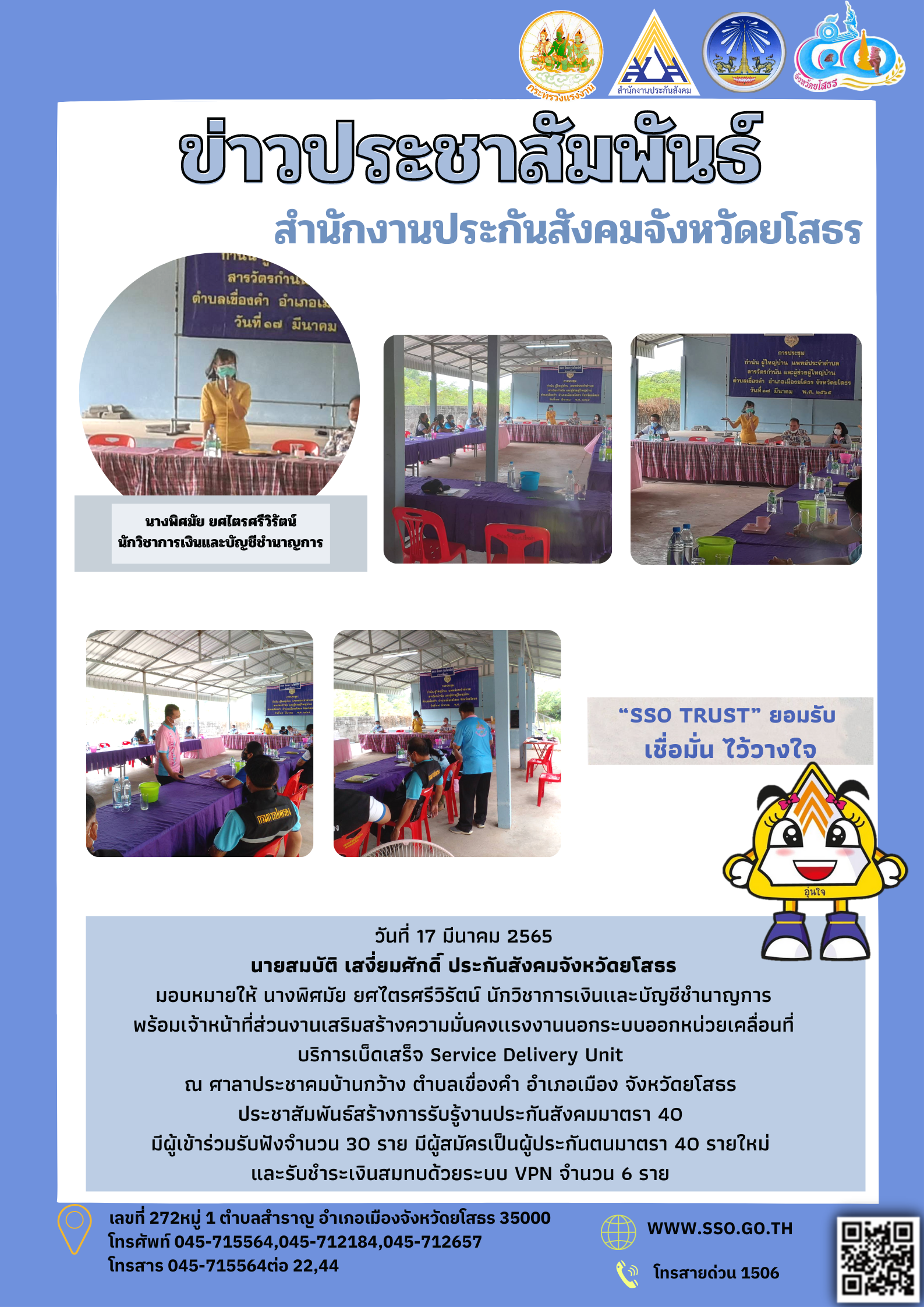 วันที่ 17 มีนาคม 2565 นายสมบัติ เสงี่ยมศักดิ์ ประกันสังคมจังหวัดยโสธร มอบหมายให้ นางพิศมัย ยศไตรศรีวิรัตน์ นักวิชาการเงินเเละบัญชีชำนาญการ พร้อมเจ้าหน้าที่ส่วนงานเสริมสร้างความมั่นคงเเรงงานนอกระบบออกหน่วยเคลื่อนที่ บริการเบ็ดเสร็จ Service Delivery