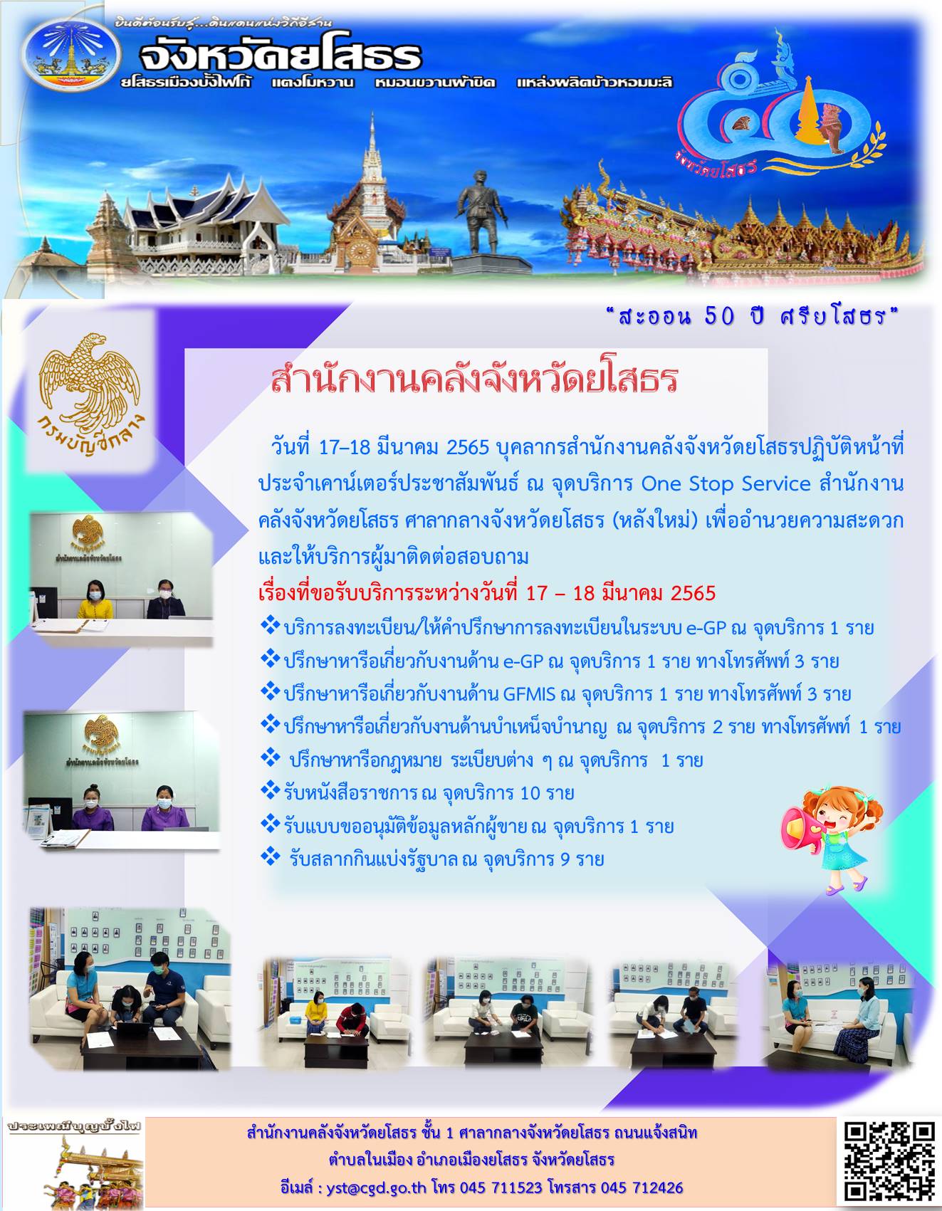 วันที่ 17–18 มีนาคม 2565 บุคลากรสำนักงานคลังจังหวัดยโสธรปฏิบัติหน้าที่ประจำเคาน์เตอร์ประชาสัมพันธ์ ณ จุดบริการ One Stop Service สำนักงานคลังจังหวัดยโสธร ศาลากลางจังหวัดยโสธร (หลังใหม่) เพื่ออำนวยความสะดวกและให้บริการผู้มาติดต่อสอบถาม